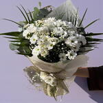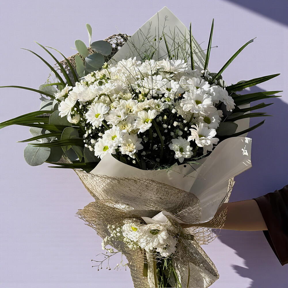 This elegant flower bouquet is made with 25 fresh daisies and 5 green leaves. Each daisy makes your loved ones feel special, while the green leaves give a fresh and lively appearance. This flower bouquet, with its natural beauty and elegance, will be a perfect gift choice in any situation.