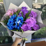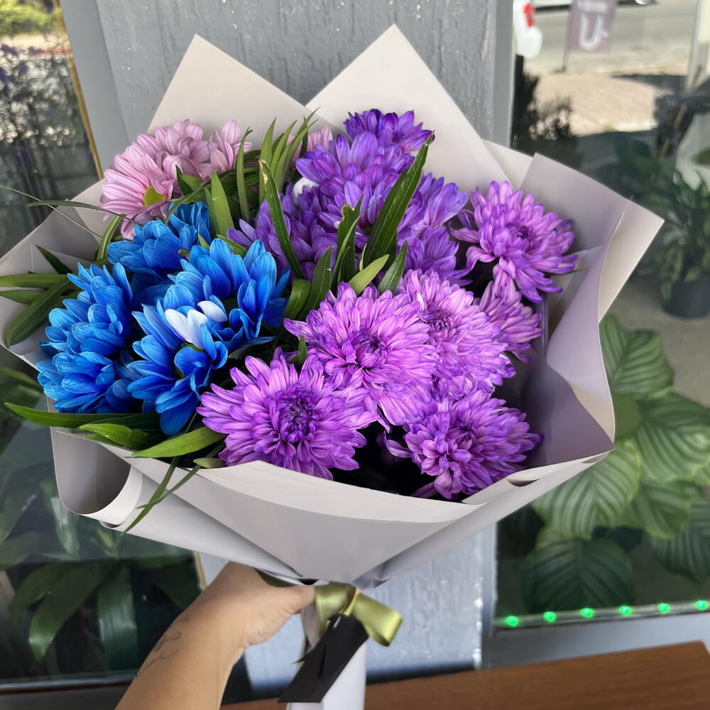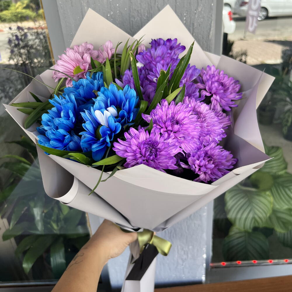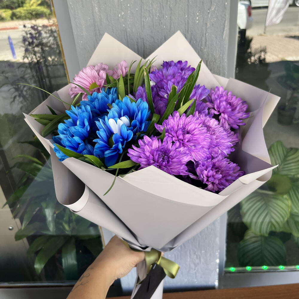 pembe papatya - 7 pcs mor papatya - 7 pcs mavi papatya - 10 pcs mor krizantem - 7 pcs