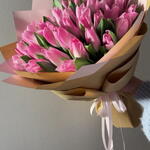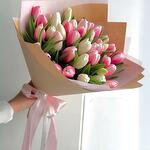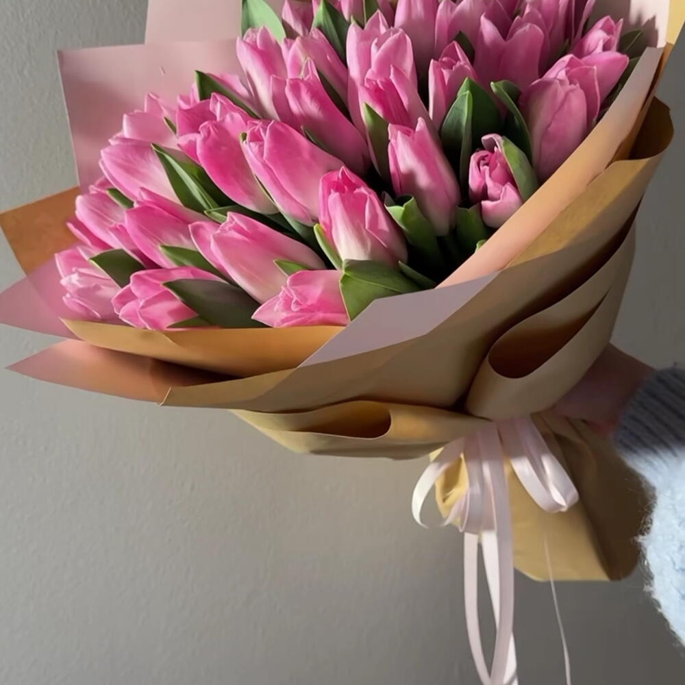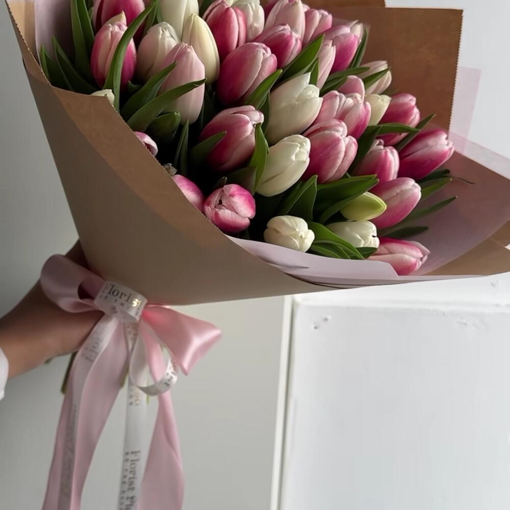 This elegant bouquet, crafted with romantic touches, reflects the perfect harmony of pink and white. 41 imported tulips are supported by natural greenery, wrapped in kraft paper, and finished with a satin ribbon. Perfect for Valentine's Day, Mother's Day, and birthdays. Care Tips: Keep tulips in a cool place, away from direct sunlight. If presented in a vase, change the water daily and trim the stems diagonally to preserve their freshness.