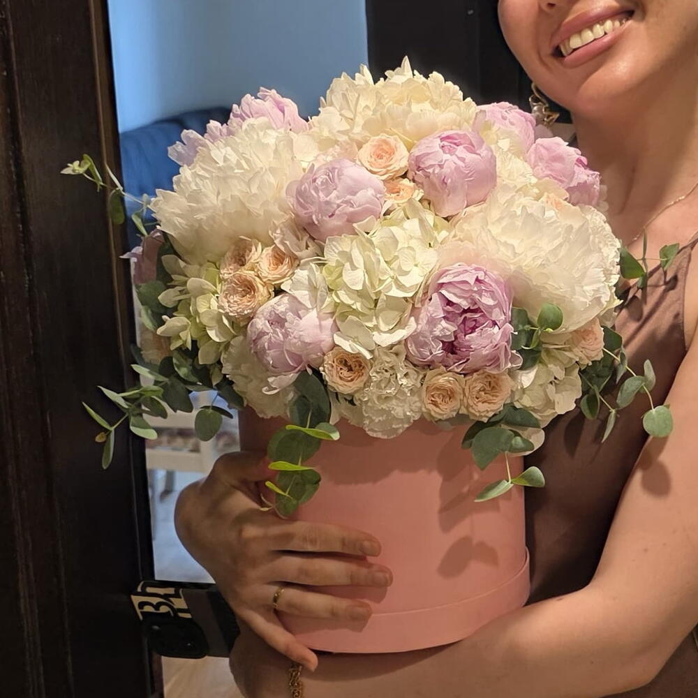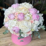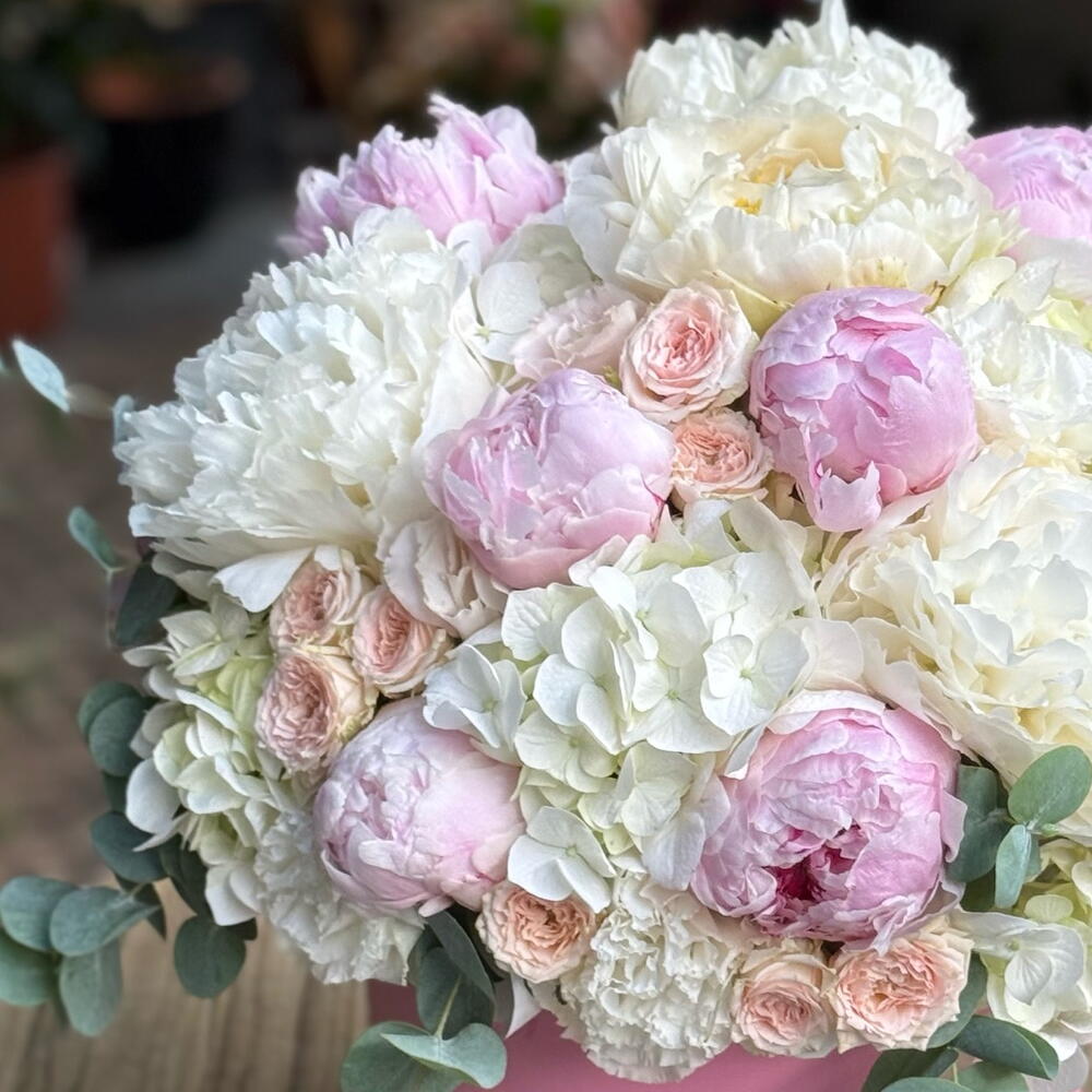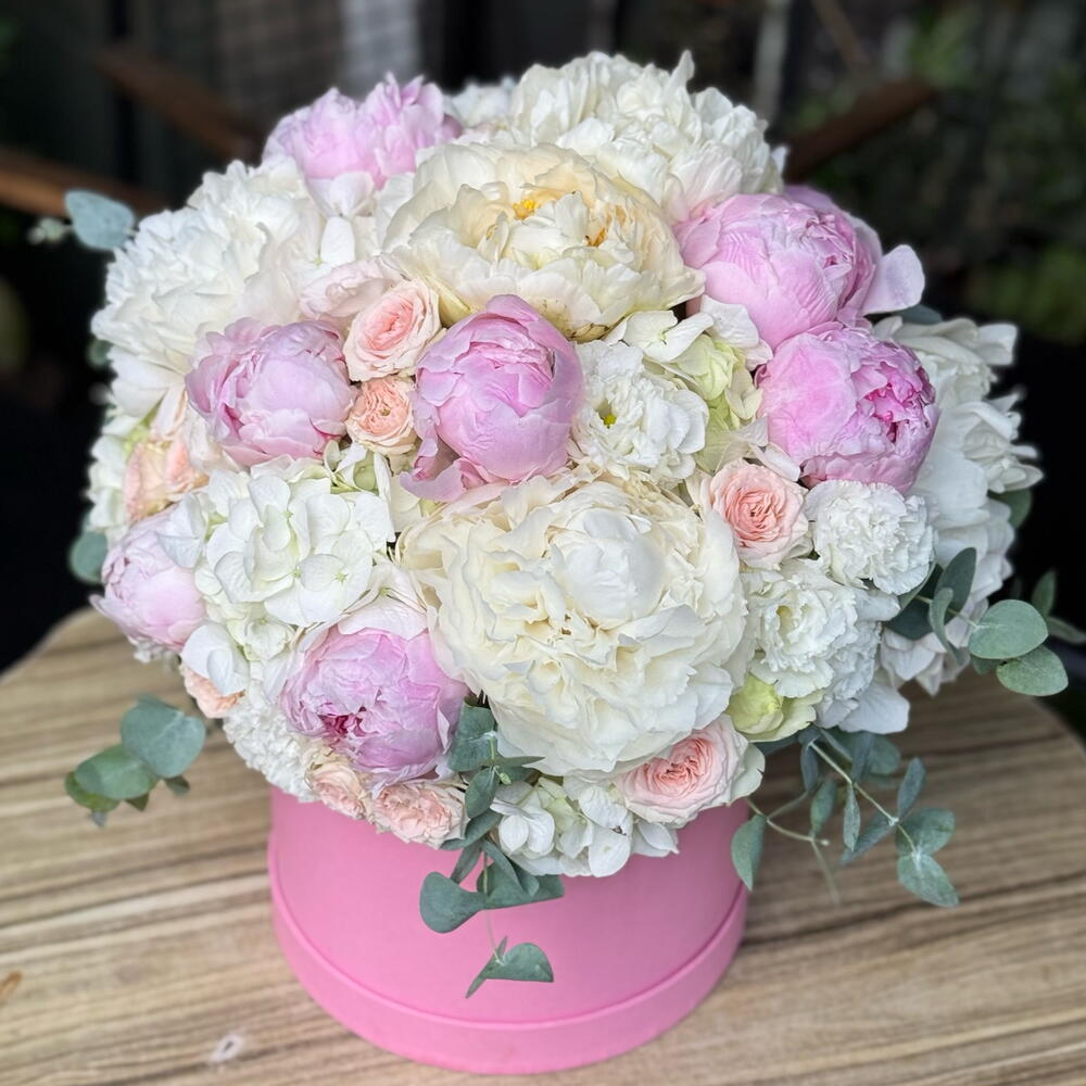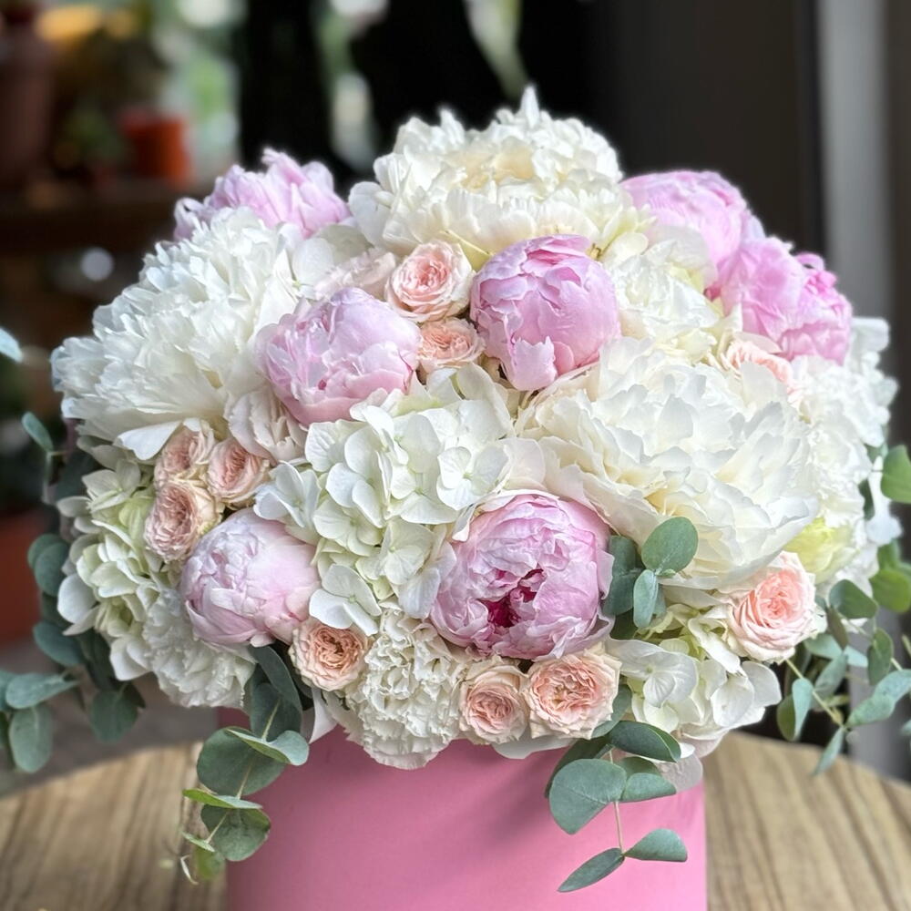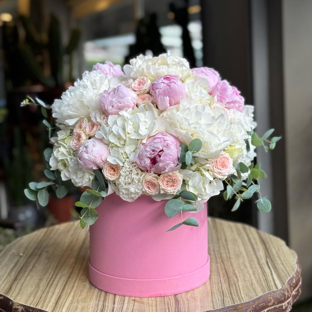Peonies, symbols of elegance and romance, captivate with their harmonious blend of pastel pink and white hues. Carefully selected peonies, pale pink roses, and eucalyptus branches are combined and presented to you in a stylish pink box. The most elegant way to express your love, An unforgettable gift for special occasions…