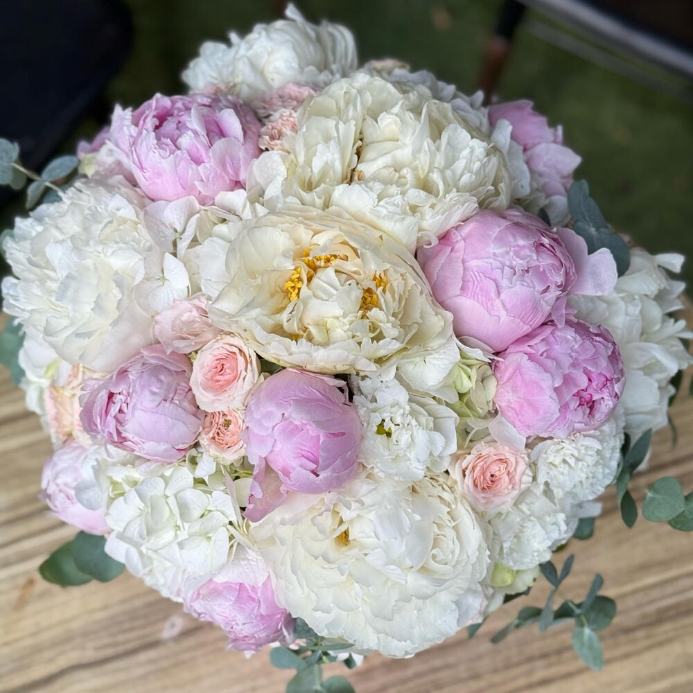 white peony - 7 pcs sarah bernhardt peony - 7 pcs ortanca (hydrangea macrophylla) - 2 pcs lisyantüs - 9 pcs ochalipthus - 8 pcs