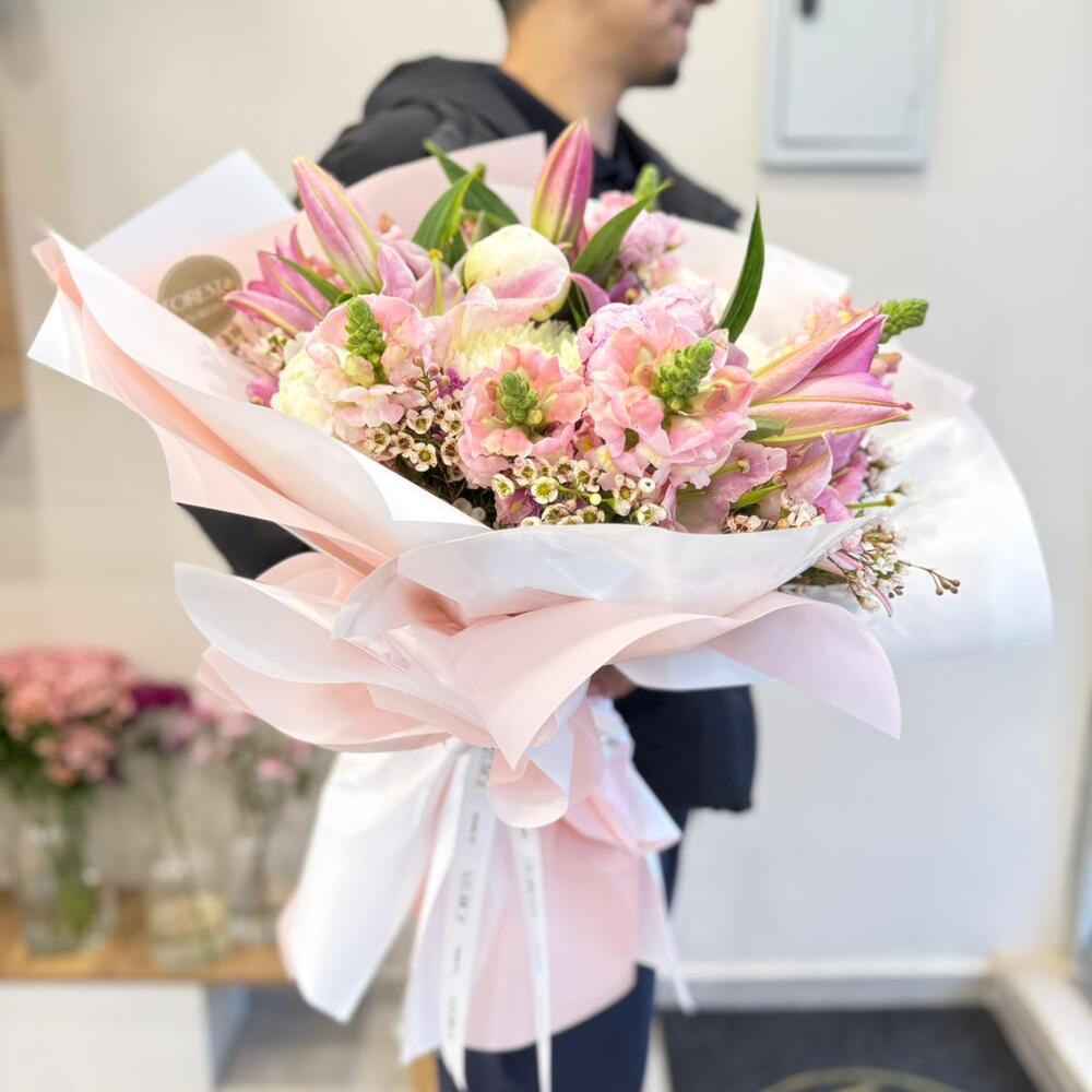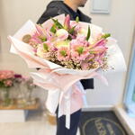 This premium-quality flower bouquet is an elegant design that appeals even to the most delicate tastes. This exquisite bouquet contains 8 delicate lilies, 3 Anastasias, 3 hardy wax flowers, 2 rare antirrhinums and 5 pieces of unusually stylish bouquet wrapping paper. These carefully selected flowers present a perfect balance and visual appeal as a whole. Whether as a gift or a sophisticated touch for your home, this enchanting flower bouquet will impress everyone.