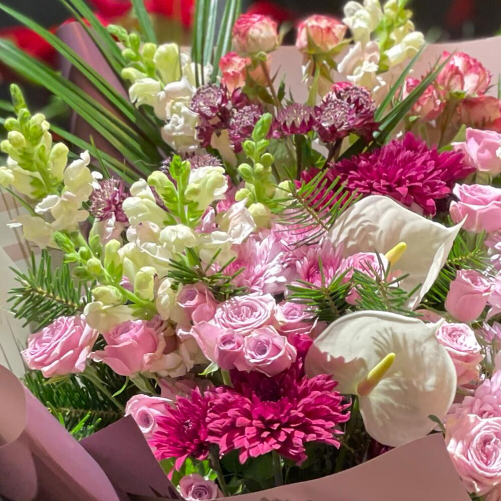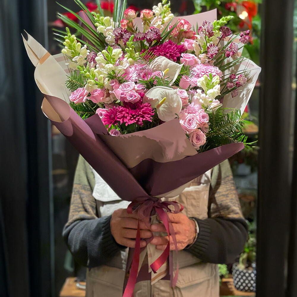 An elegant bouquet design featuring pink roses, white anthuriums, snapdragons, and colorful seasonal flowers. Product height: 60 cm.