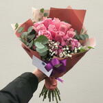 Ribbon - 1 pcs Eucalyptus - 4 pcs bouquet with premium pink rose - 12 pcs packgıng - 1 pcs pink seasonal flower - 3 pcs