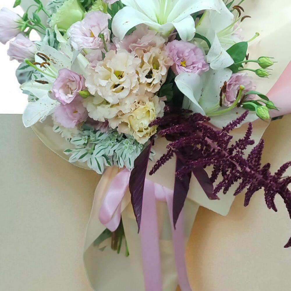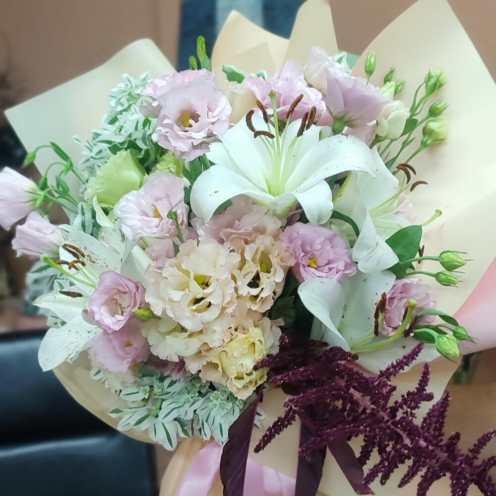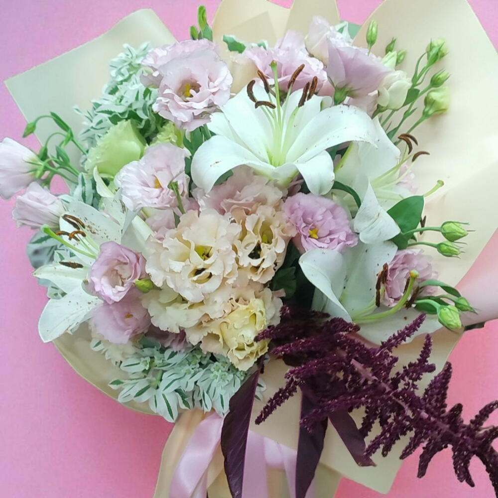 Lily - 3 pcs lisianthus pink - 7 pcs salmon lisianthus - 11 pcs decorative leaves - 7 pcs