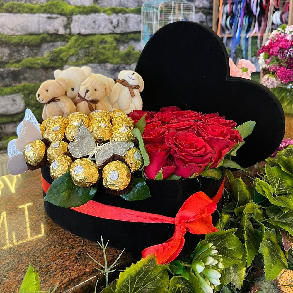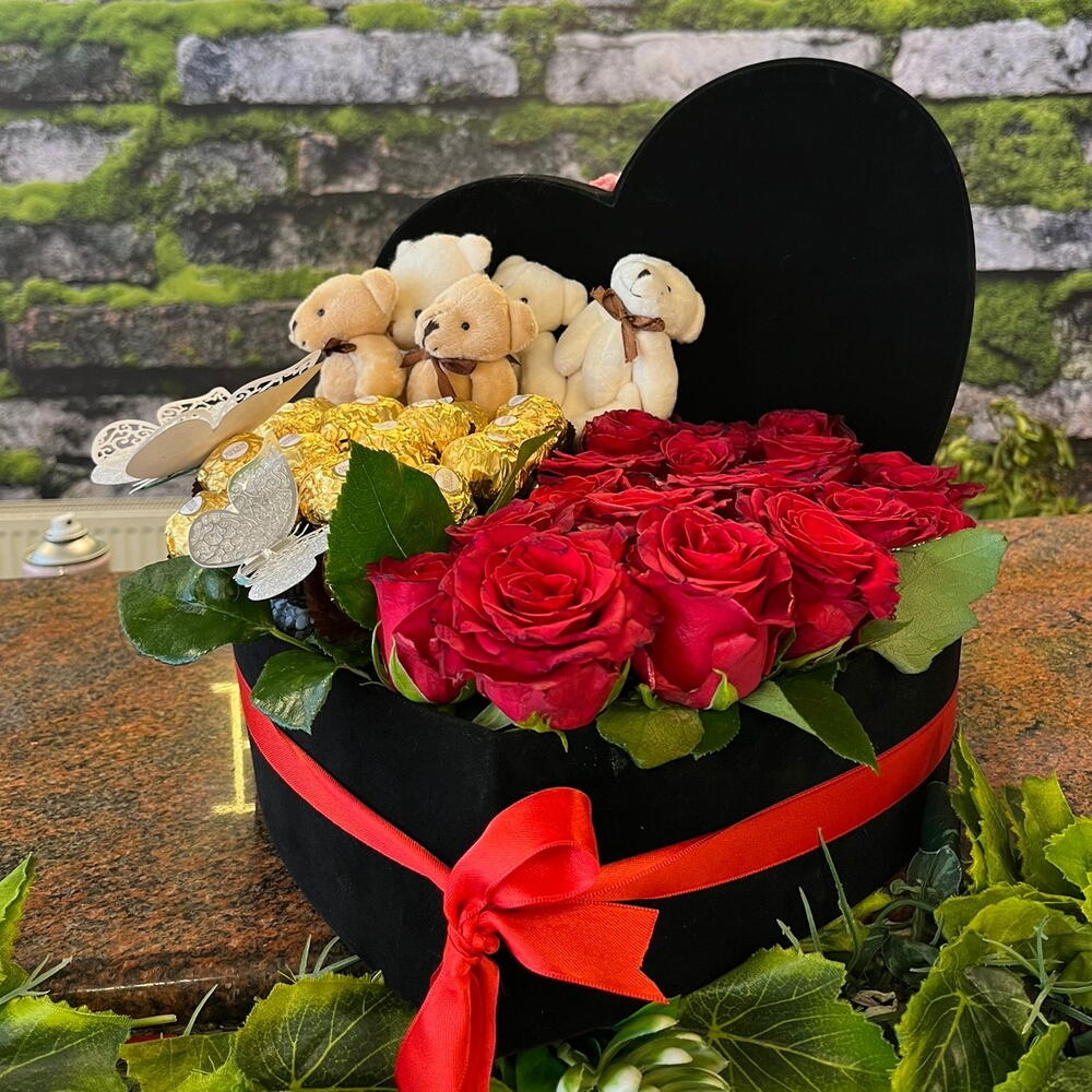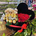 An elegant, striking and love-filled design! 🌸 15 imported red roses represent the passion of love; the 6 mini plush bears inside the box add a cute warmth. 🧸💞 25 Ferrero Rocher chocolates that enchant with their taste turn this special set into both a romantic and a sweet surprise. 🍫 🌹 The black velvet box conveys quality with its luxurious appearance and soft texture. With its medium-sized design, this set has an elegant yet bold presence, offering an unforgettable gift option for special occasions.