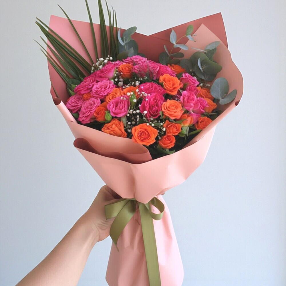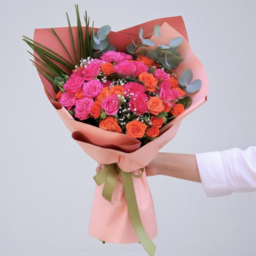 Bu büyüleyici çiçek buketi, romantizmi ve neşeyi simgeleyen 10 adet Pembe Çardak Gülü ve 10 adet Turuncu Çardak Gülü ile doludur. Her biri özenle seçilmiş ve mükemmel bir kompozisyon oluşturmak için birleştirilmiştir. Çiçeklerin taze ve canlı görünümü, herhangi bir odaya anında enerji ve renk katabilir. Bu zarif çiçek buketi, özel biri için mükemmel bir hediye seçeneği olabilir.