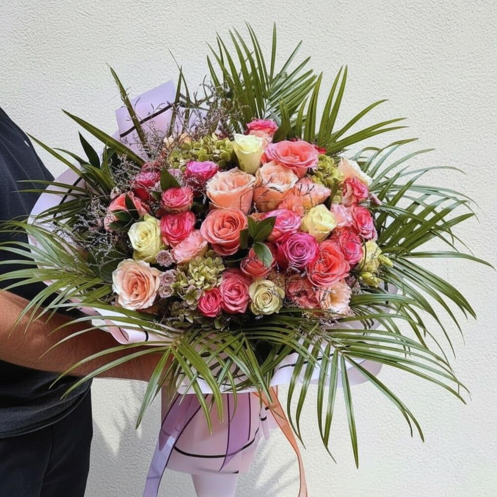 Bu özel tasarım çiçek aranjmanı, seçkin görünümüyle dikkat çekmekte. Beş adet beyaz gül ve yedişer adet pembe ve turuncu güllerle öne çıkan bu aranjman, aynı zamanda beş adet mor gül ile görsel bir şölen sunuyor. Ayrıca 10 adet kurutulmuş çiçek ve 4 adet dekoratif paketin çarpıcı birleşimini barındırıyor. Bu aranjman, herhangi bir özel gün için ideal, ayrıca birçok çeşitli olay ve sevdikleriniz için de mükemmel bir hediye olabilir.