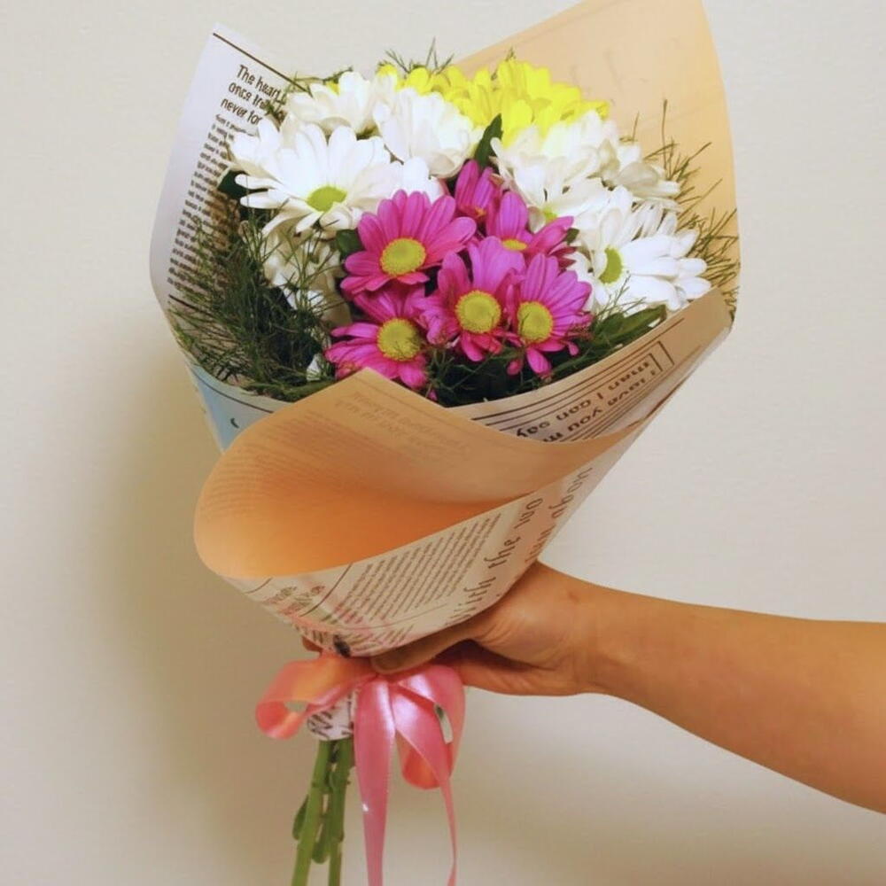 🌼 Colorful Daisy Bouquet – A Symbol of Joy and Elegance 🌼 Brighten your loved ones' day with this colorful daisy bouquet! Crafted with a stunning harmony of white, yellow, and pink tones, this chic arrangement symbolizes happiness, love, and hope. With its rustic newspaper packaging and pink ribbon detail, this bouquet stands out and is a perfect choice for every special moment. From birthdays to thank you notes, choose this Colorful Daisy Bouquet to make your loved ones happy or simply to bring a smile to their faces. Express your love and happiness in an elegant way.
