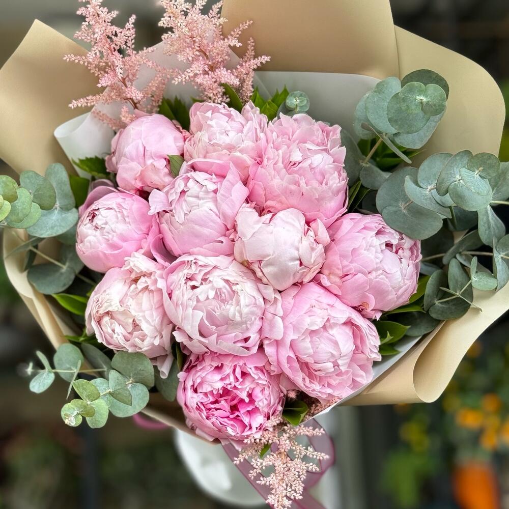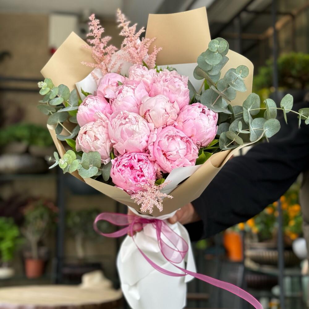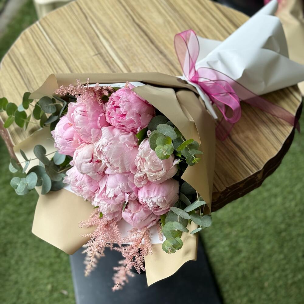 Bu büyüleyici çiçek buketi, romantizmi ve duygusallığı simgeleyen 10 adet pembe şakayık ve zarif ve taze bir görünüm sağlayan 7 adet eukaliptus içerir. Bu özenle tasarlanmış buket, birine ne kadar değer verdiğinizi göstermek için mükemmel olan doğal güzelliği ve sofistike şıklığı birleştirir. Her bir çiçek, sizin için büyük bir özenle seçildi ve bir arada herhangi bir odaya canlılık ve sıcaklık katacak olan mükemmel kompozisyonu oluşturdu.