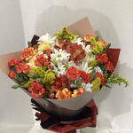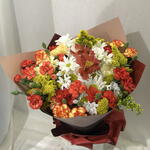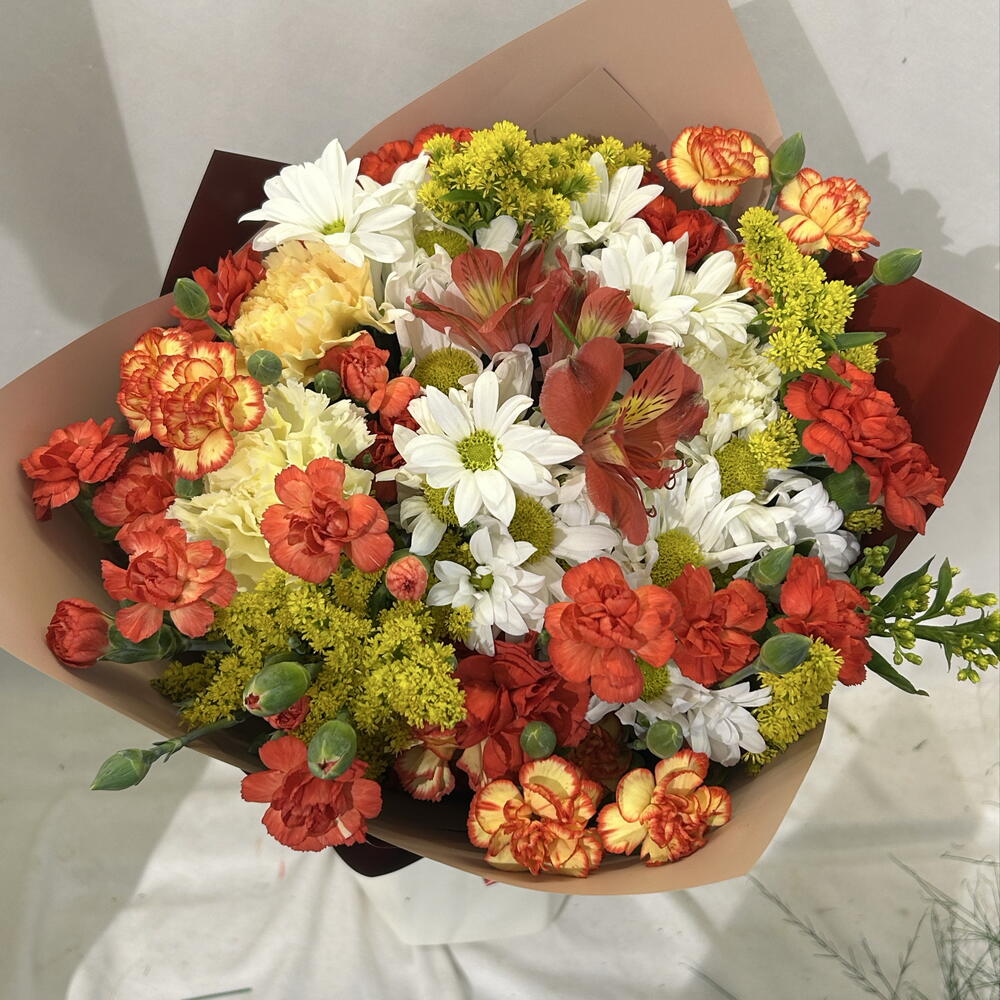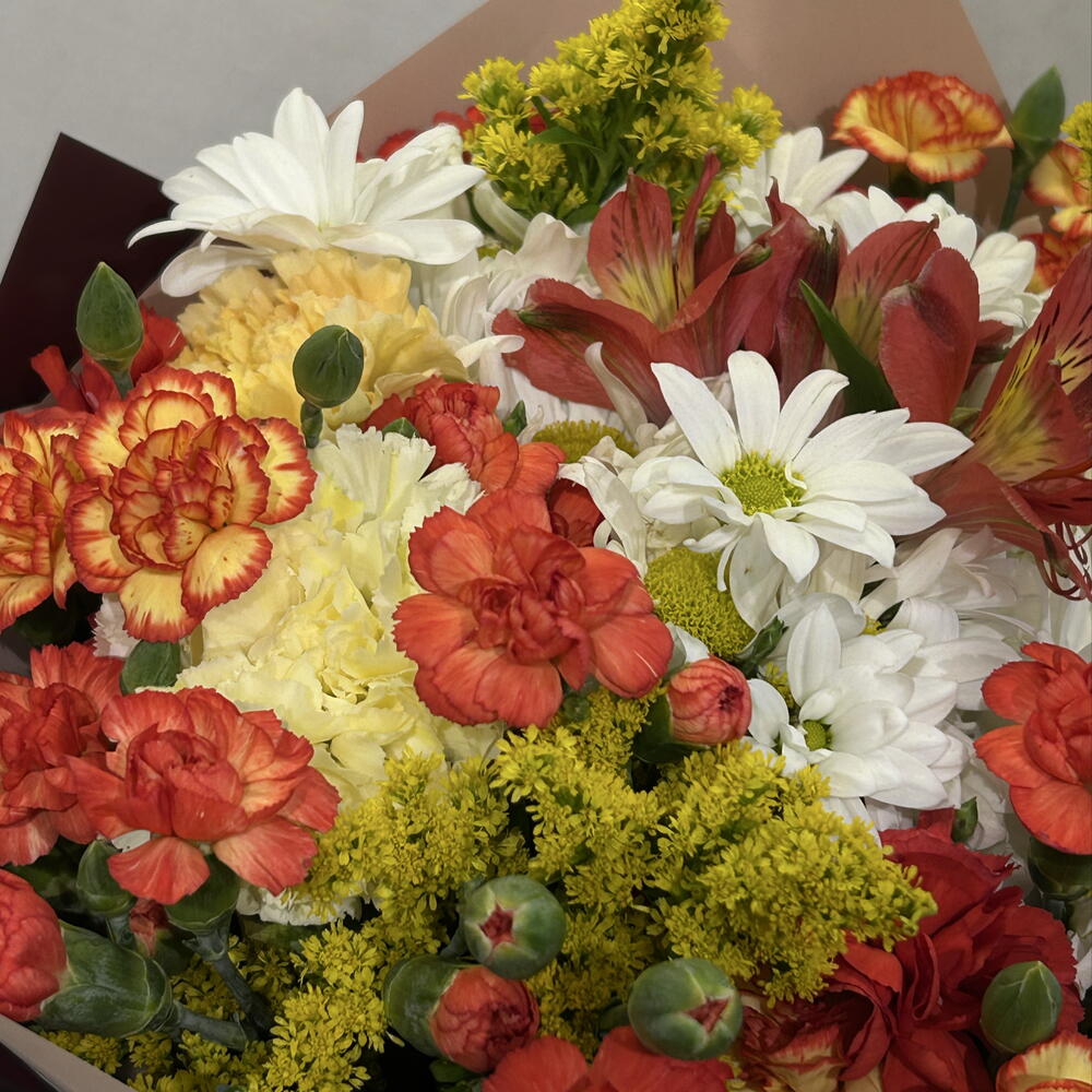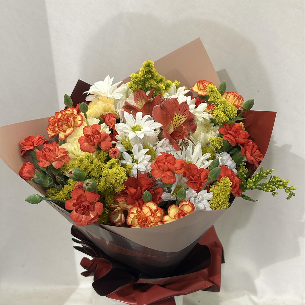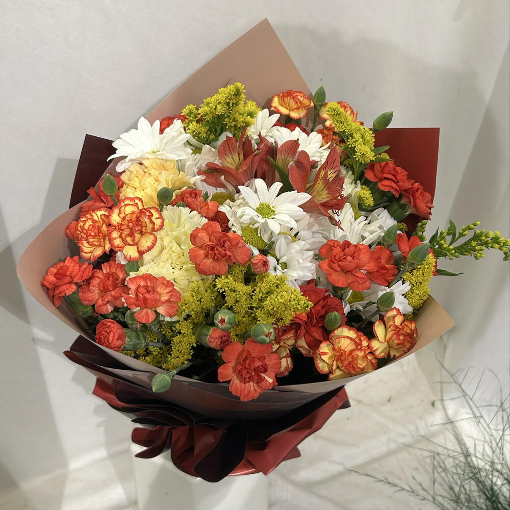 A stylish bouquet prepared with the harmony of vibrant colors 🌼 The combination of white daisies, red and orange carnations and yellow filler flowers offers an energetic and elegant look. A perfect choice to add joy and warmth to your loved ones.