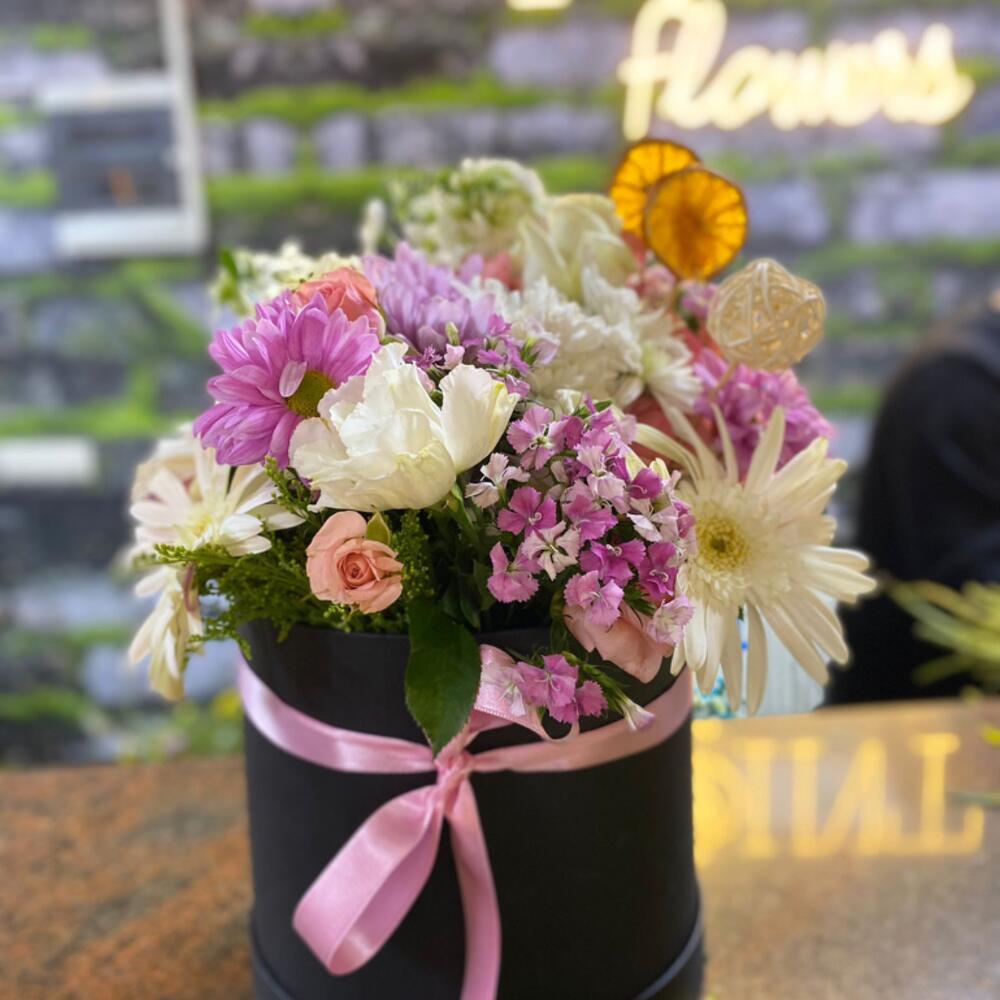 In this elegant black box, a captivating floral arrangement awaits you. It contains 5 chrysanthemums, 7 daisies, 4 graceful arbor roses, 5 cipso, 2 delicate sweet peas, 7 baby's breath flowers, and 4 colorful gerberas. Accompanied by 2 fresh orange slices placed next to this beautiful set, it further highlights all the colors of the flowers. This box offers a feast that satisfies both visually and aromatically. An excellent choice for yourself, your loved ones, or as a gift on special occasions.