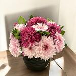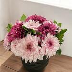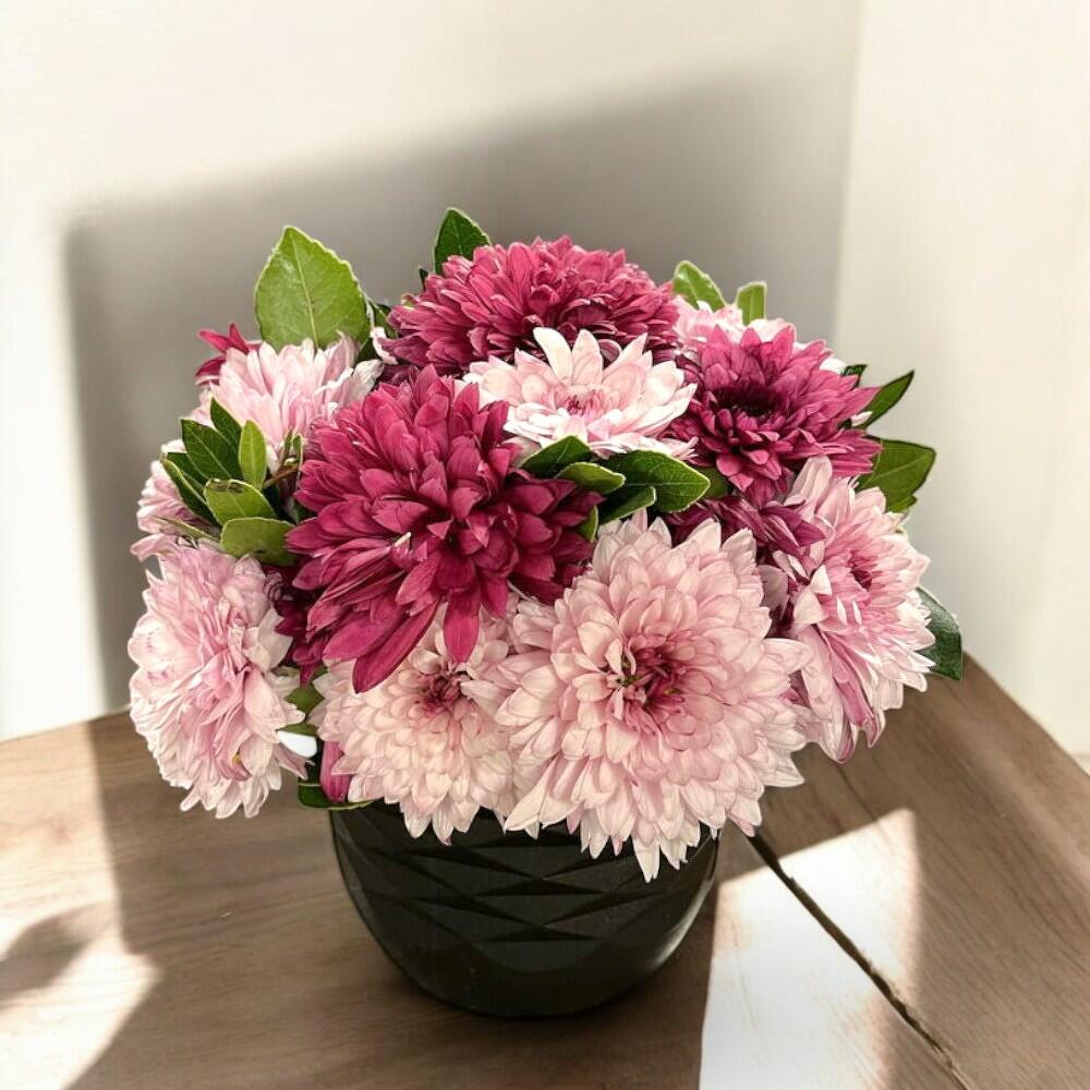 Presented in a sleek black pot, this arrangement of purple and pink chrysanthemums combines elegance and naturalness. Its bright colors and full structure add freshness to indoor spaces. It is a great gift option for special occasions, as well as being ideal for home and office decoration. Care Tips: Chrysanthemums should be kept away from direct sunlight, in a well-lit environment. Watering should be done twice a week, enough to keep the soil slightly moist. The potting soil should have good drainage, and excess water should not be allowed to accumulate. To ensure the flowers last long, wilted leaves and flowers should be regularly cleaned.