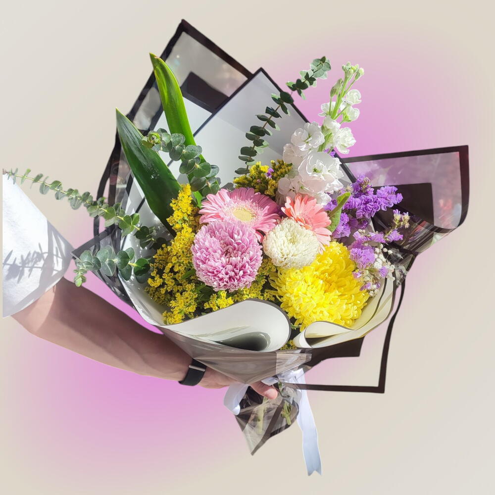 mini gerbera - 1 pcs gerbera pink - 1 pcs eucalyptus - 3 pcs anastasia - 3 pcs green leaves - 2 pcs sweet pea white - 1 pcs solidago nemoralis yellow - 3 pcs purple limonium sinuatum - 3 pcs