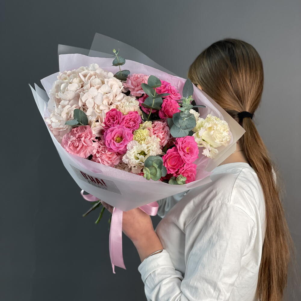 Hydrangea - 1 pcs Bush rose - 5 pcs Carnation - 3 pcs Eustoma - 2 pcs