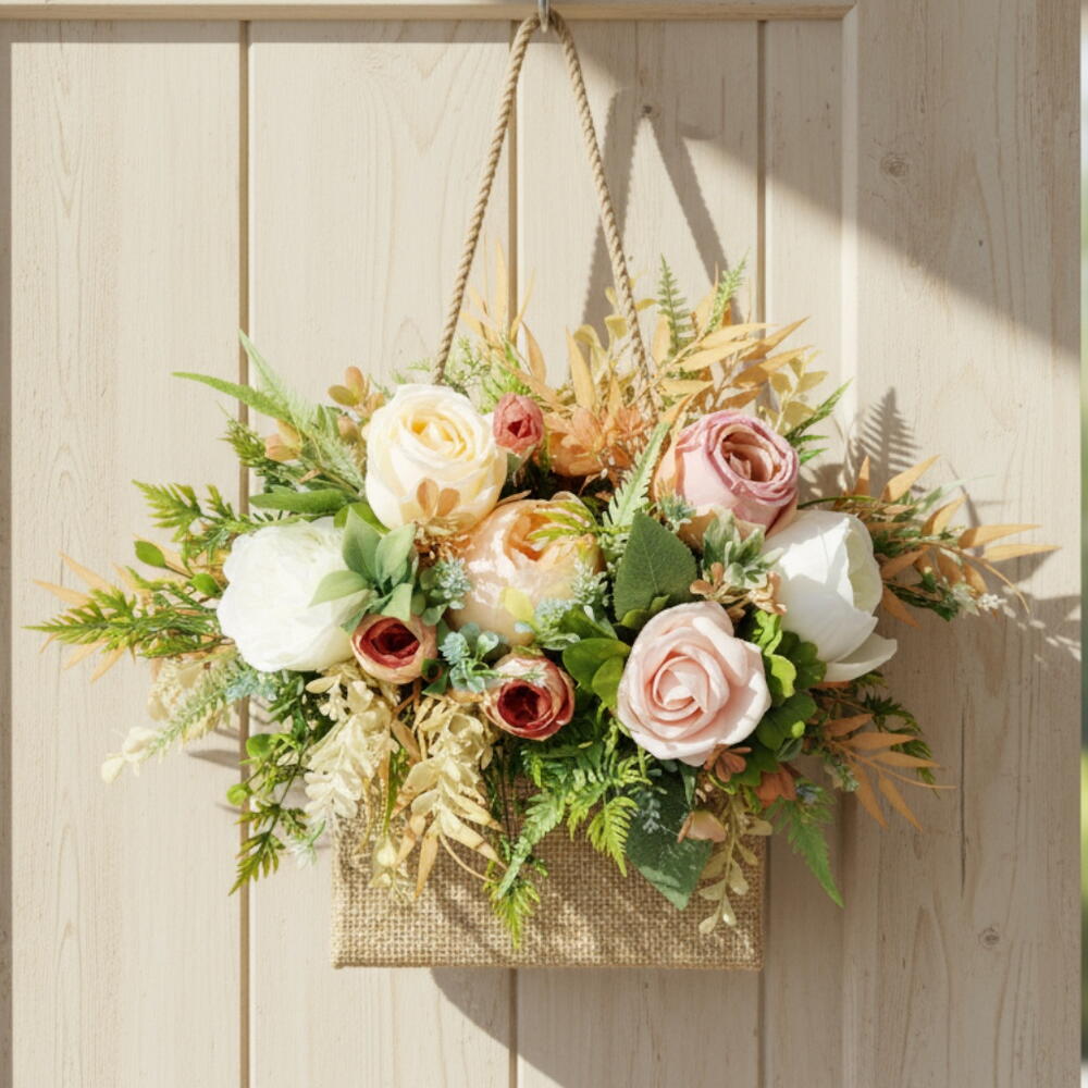 This product is a decorative flower set. The set includes four peony flowers in shades of pale pink and white, three pale yellow roses, four medium-sized pale pink flowers, and four small dried pink buds. Additionally, the package includes one green leaf and one yellow dried leaf sprig, and ten cream and white mini filler flowers and herbs. Add freshness, color, and a natural look to your living spaces with this flower set.
