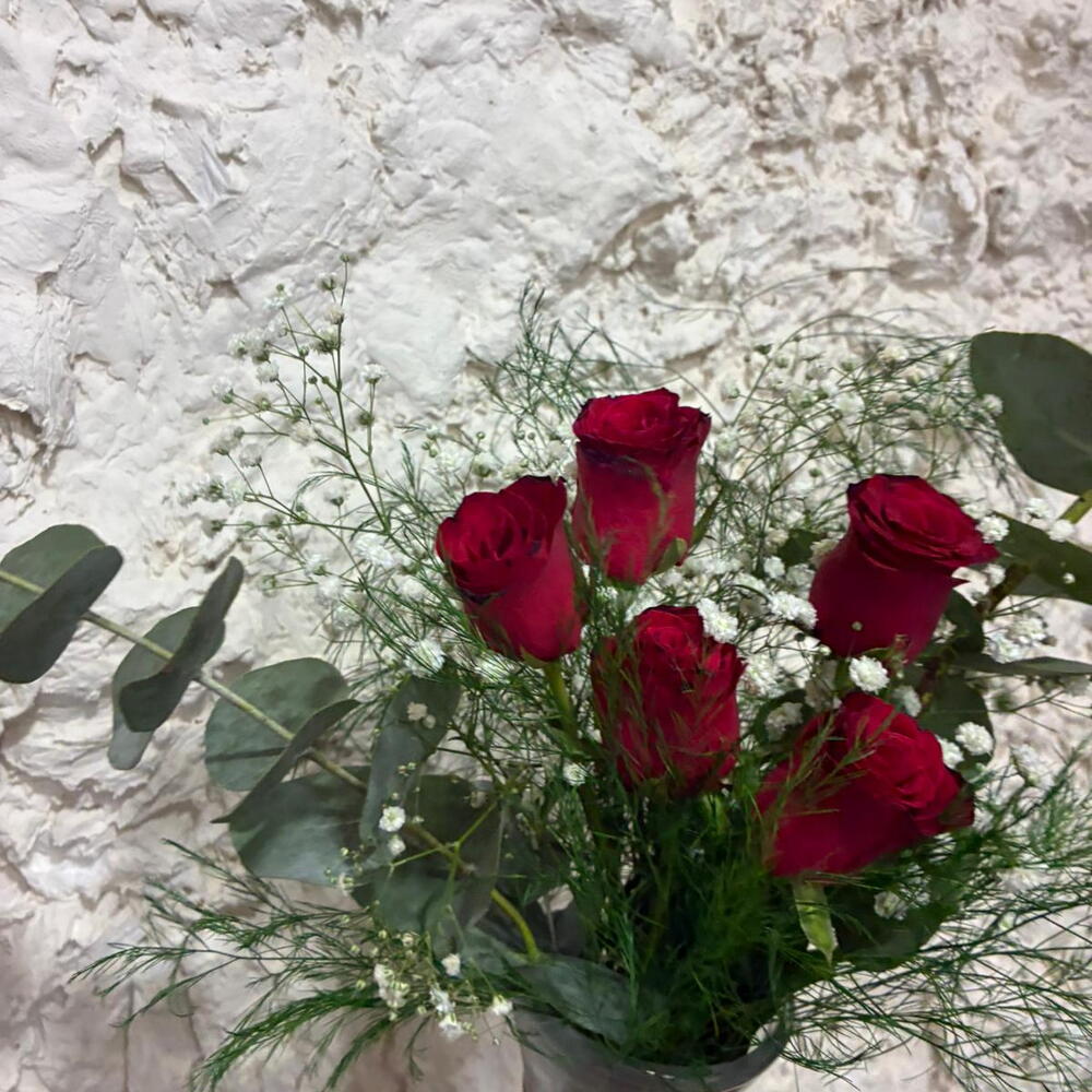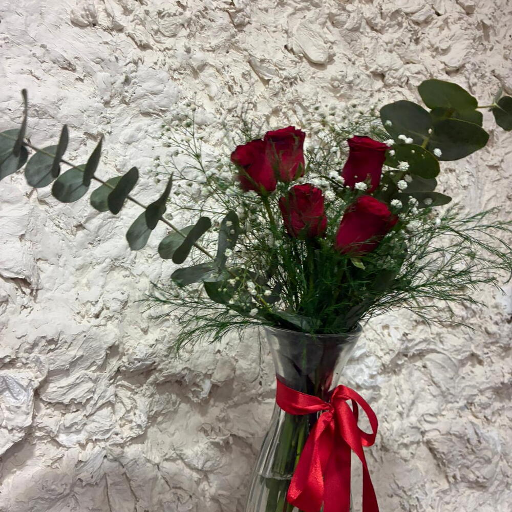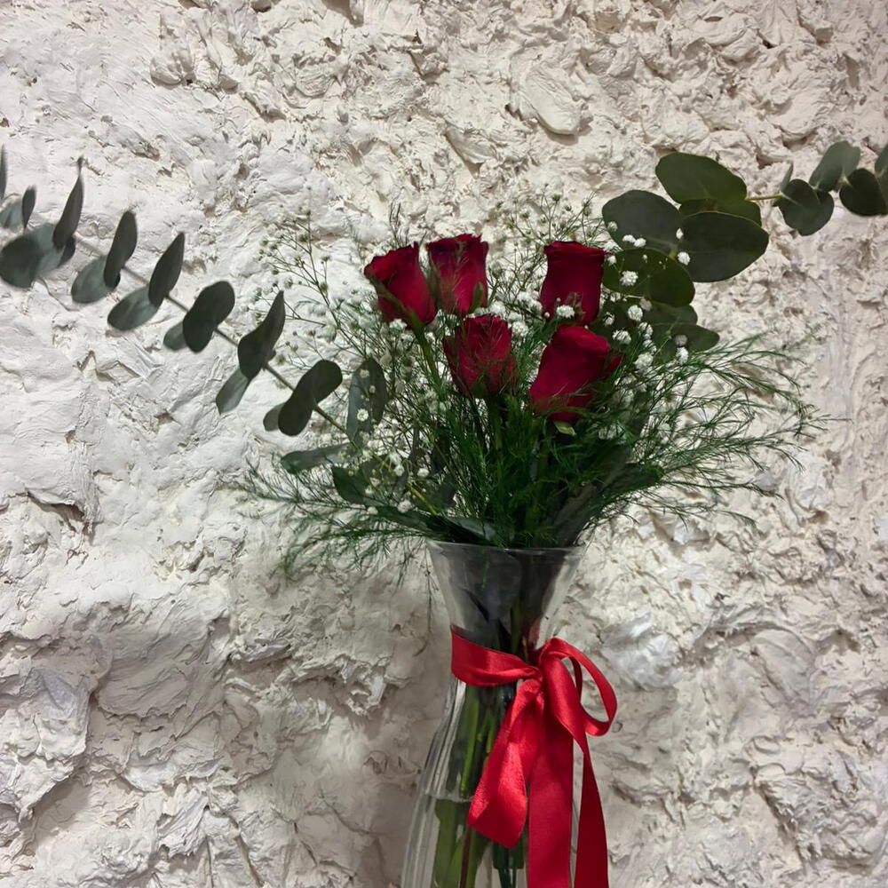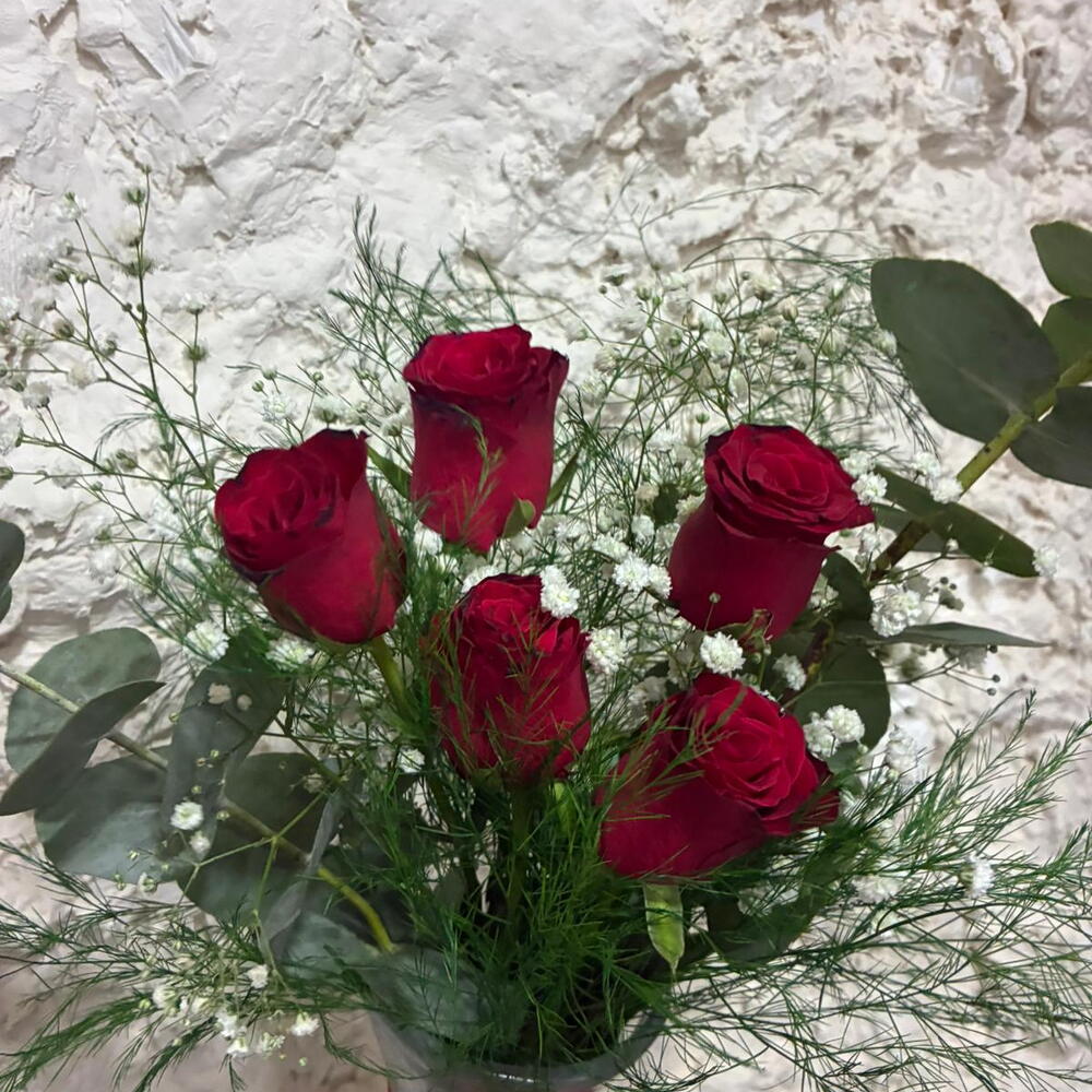 This striking flower bouquet is prepared with 5 red roses, a symbol of love and passion. With three delicate gypsophila and refreshing eucalyptus tones, this bouquet showcases the beauty of nature. The bouquet includes 3 sprigs of iron herb, giving it an elegant and sophisticated touch. The combination of these flowers creates a romantic and enchanting gift. Suitable for any setting, this bouquet is the perfect choice to show your loved ones how much you care.