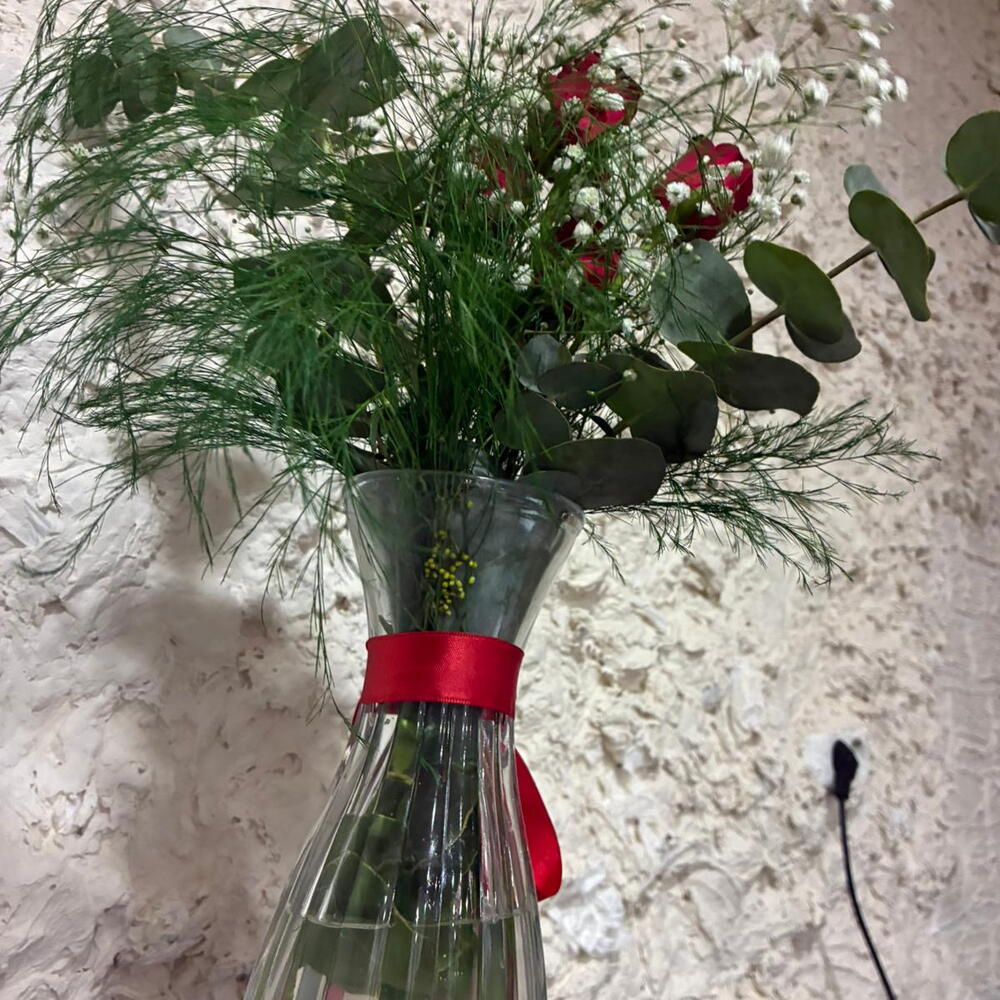 kırmızı gül - 5 pcs okaliptus - 2 pcs gypsophila - 3 pcs iron herb - 3 pcs