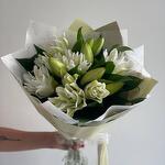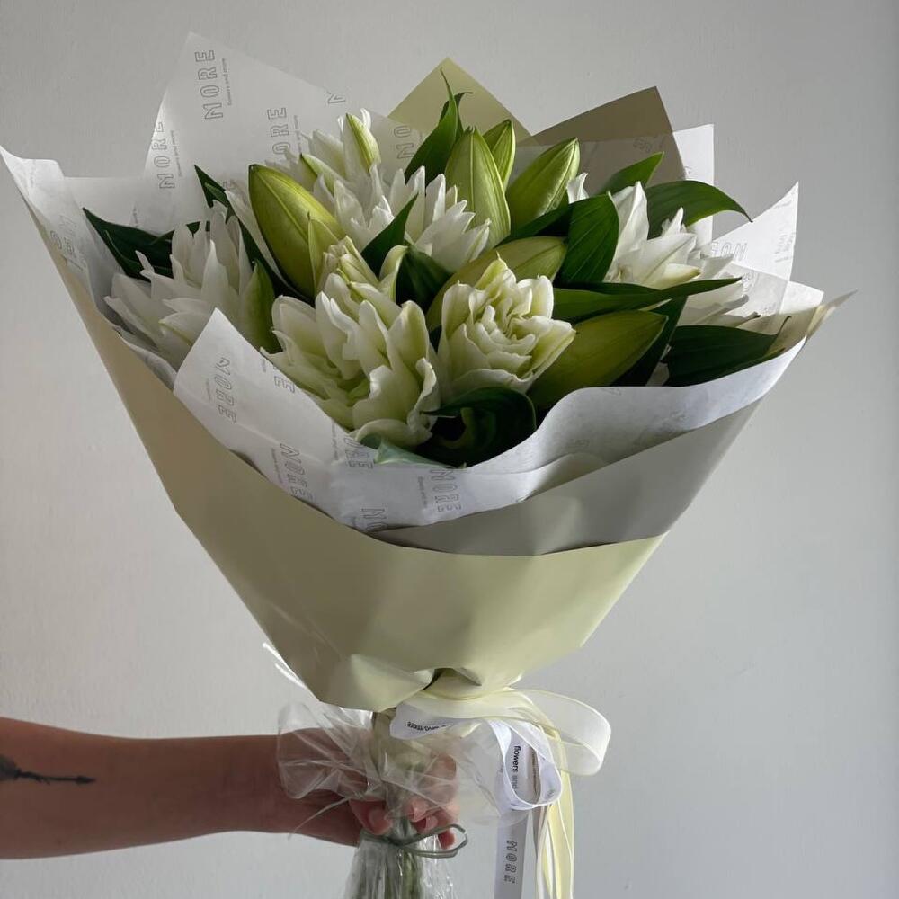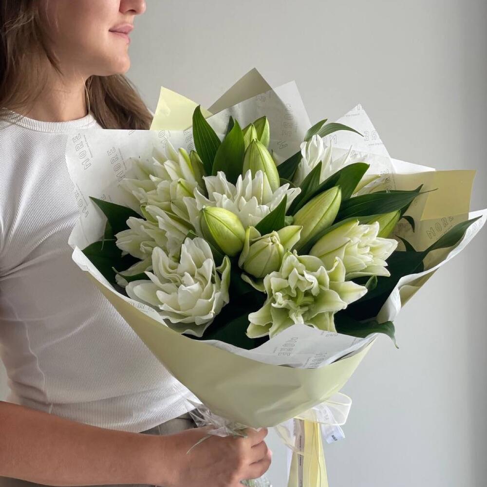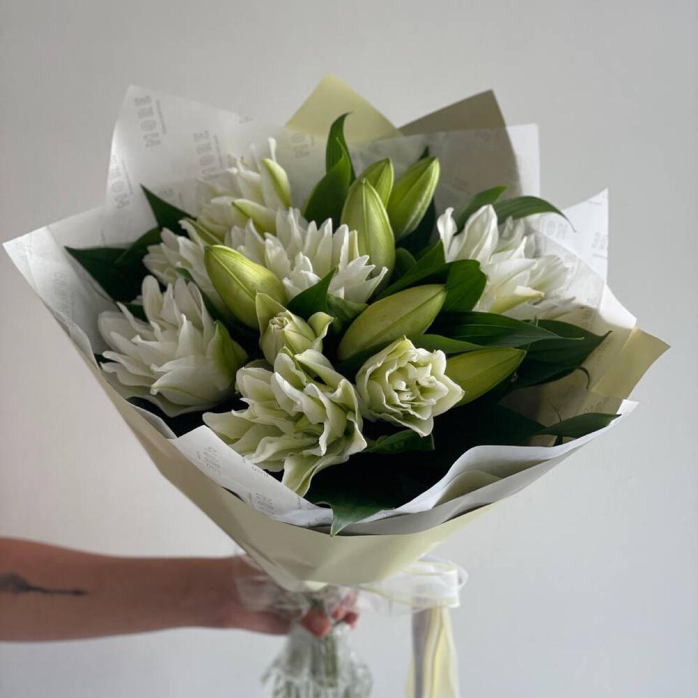 This magnificent mono-bouquet is perfect as a gift for a special occasion or as an expression of your feelings. The composition includes 9 exquisite lilies, carefully wrapped in 2 sheets of decorative paper and placed in an aqua box to maintain the bouquets freshness and preservation. The elegance and simplicity of this bouquet will undoubtedly delight your loved ones.