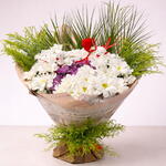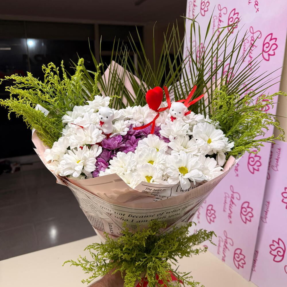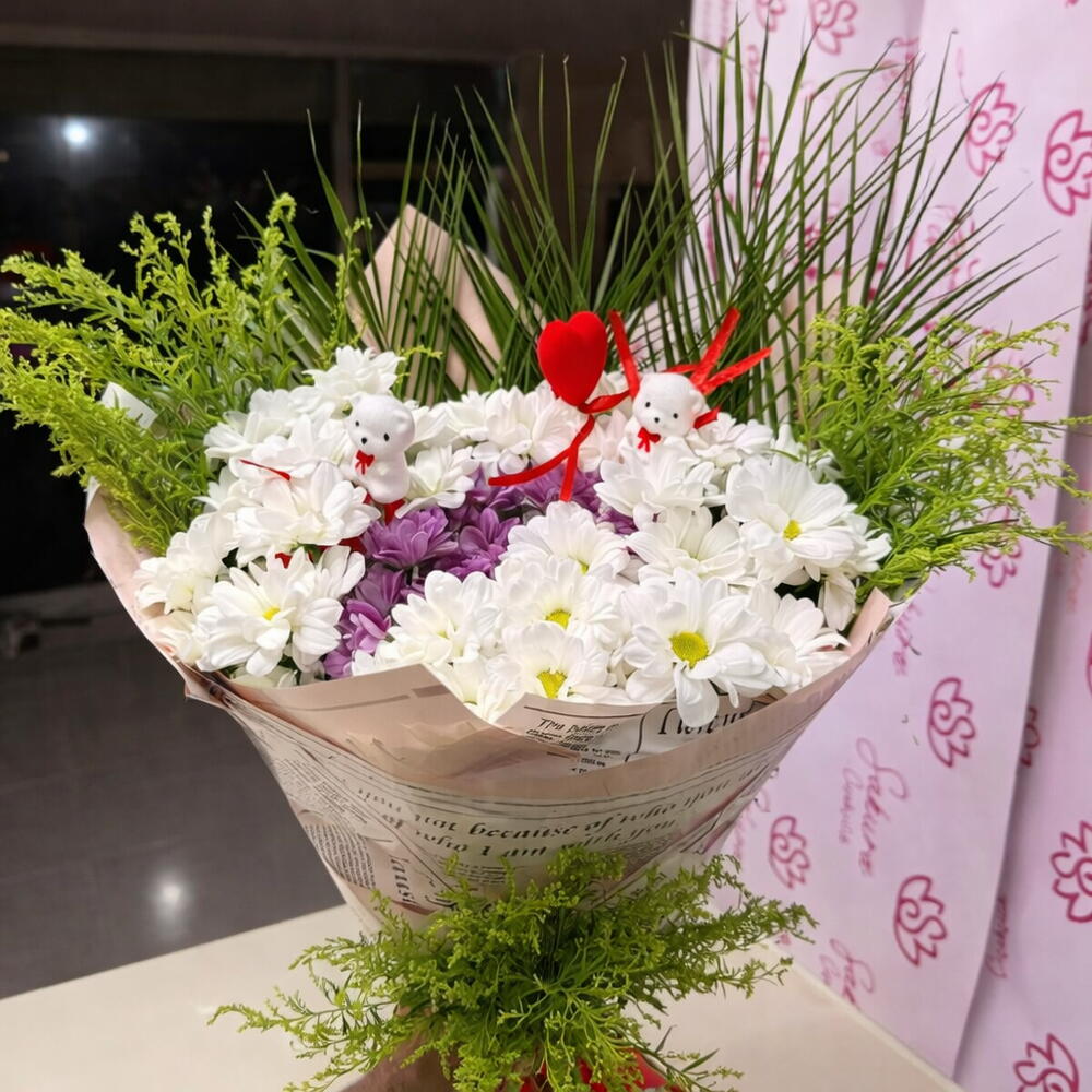 This flower bouquet is adorned with 15 beautiful, fresh white chrysanthemums and 6 purple chrysanthemums. The composition is completed with 2 white teddy bear figures, symbols of innocence and love, and a red heart figure as a sign of love. This flower bouquet expresses your feelings for your loved ones in the best way. It appeals to the eye and, through the meanings it carries, reflects your emotions.