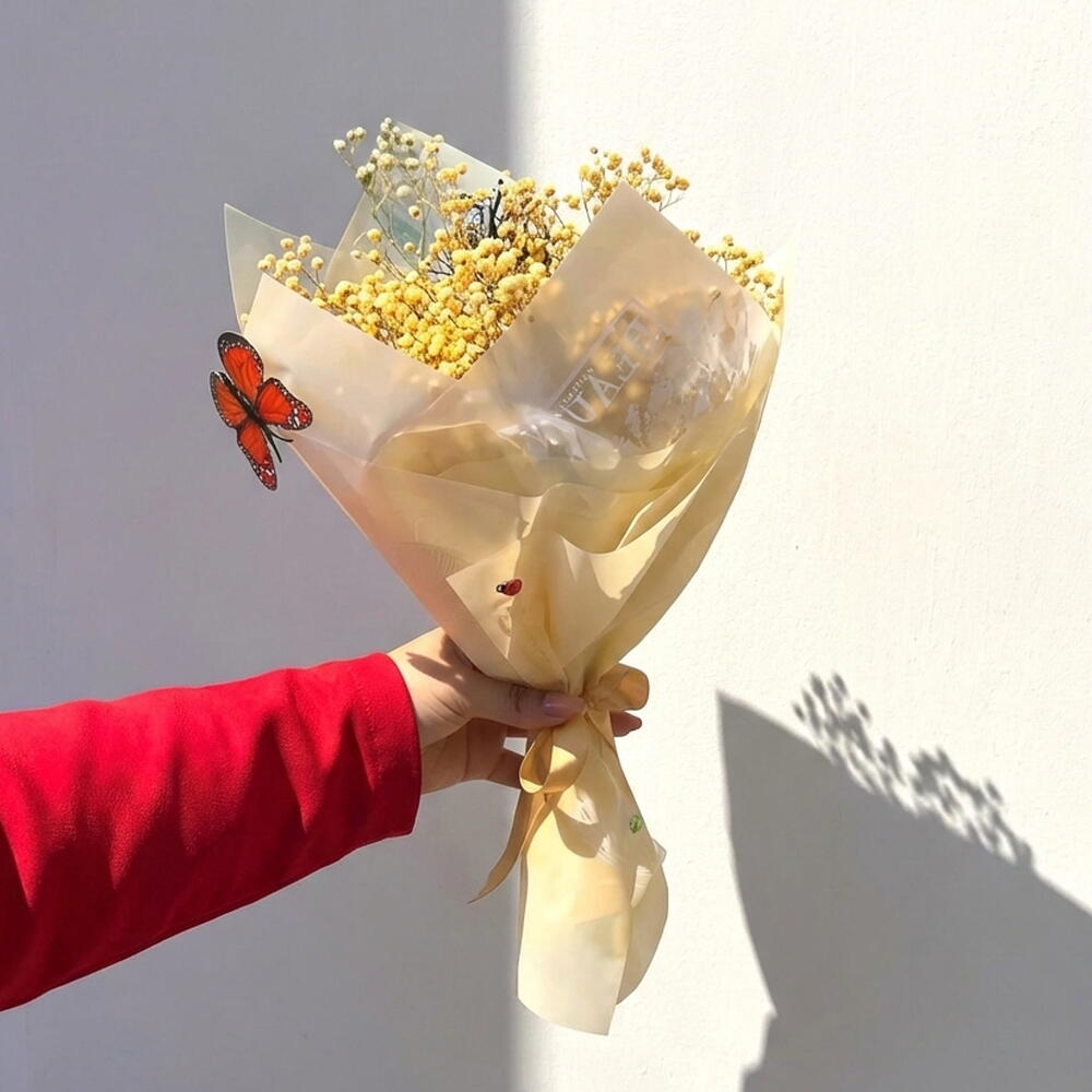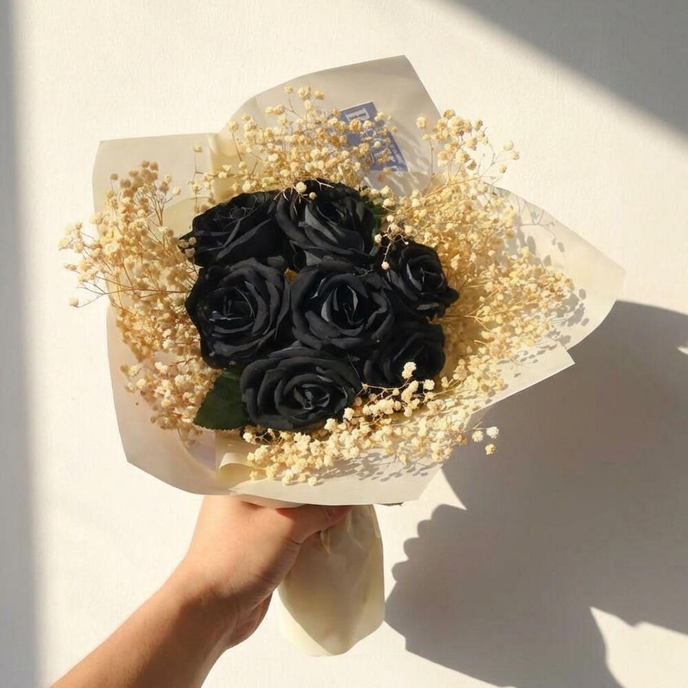 Artificial Black Rose Bouquet is a perfect choice for those seeking a sophisticated and attractive decoration alternative. This elegant bouquet is designed with 7 carefully selected black roses. Black roses symbolize the depth of love, the power of passion, and respect. The bouquet pairs perfectly with gold-colored gypsophila flowers that provide contrast, offering a look that is both elegant and unconventional. Care Instructions: Caring for artificial roses is extremely simple. To remove dust from the bouquet, simply wipe it regularly with a soft cloth. Keep the bouquet away from direct sunlight to prevent the colors from fading. Artificial flowers remain looking fresh for a long time, so this bouquet will preserve its elegance over time.