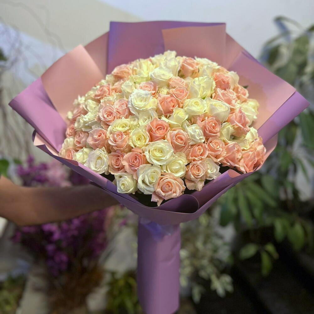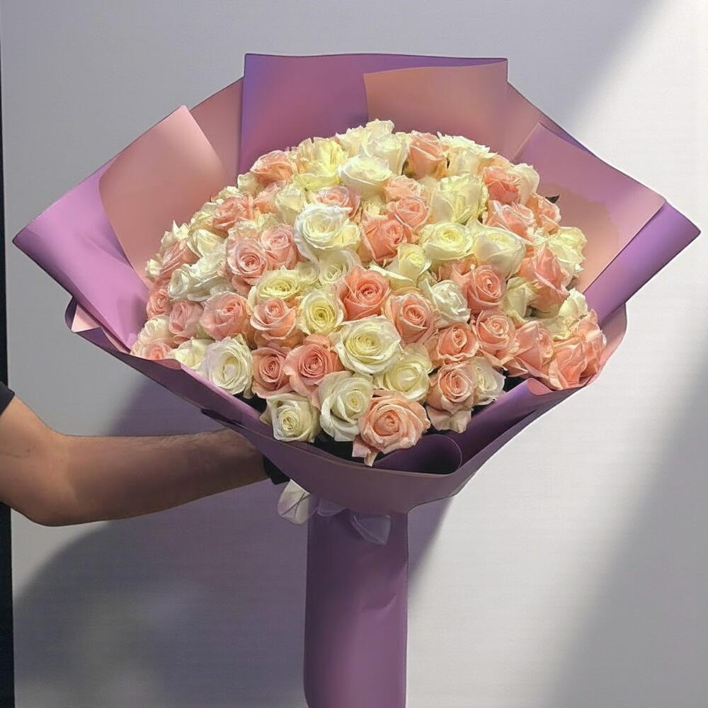 Prepared with the enchanting harmony of pastel tones, this elegant bouquet 🌷 combines elegance and delicacy. The soft transitions of peach, cream and light pink roses simultaneously reflect tranquility and romance. With its modern purple wrapping and graceful white ribbon, it offers an impressive gift option for special occasions. For your partner, your mother, or a close friend, it is the most delicate way to express your feelings. To preserve your bouquet's beauty, cut 1-2 cm off the stem tips every two days and keep it in cool, clean water. Keep it away from direct sunlight to maintain its freshness for longer.