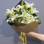 This bouquet, made with white lilies that symbolize elegance and purity, adds meaning to your special moments with its impressive presence. Lily flowers, one of nature's most beautiful gifts, bring peace and freshness to any environment with their striking appearance and delightful fragrance. Completed with a stylish brown packaging and a golden yellow ribbon detail, this arrangement is a perfect choice for making a meaningful surprise for your loved ones! To keep your lilies fresh for a longer period, you can maintain them in a vase filled with clean water by cutting the stems at regular intervals. Care should be taken to ensure that the flowers are not exposed to direct sunlight and wind.