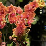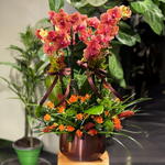 A spectacular design prepared with 4 stems of orange orchids and orange spray roses at the base in a metal vase with a copper finish.