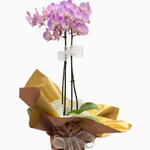 İthal çift dallı mor orkide, şık seramik vazo hediyesiyle birlikte gönderilir.