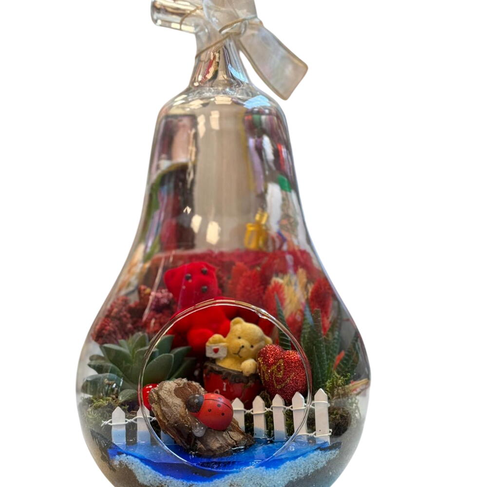 Sevimli ve romantik detaylarla tasarlanan bu orta boy armut cam teraryum, özel günlerde anlamlı bir hediye ve şık bir dekoratif üründür. Cam fanus içerisinde canlı sukulent ve kaktüsler, ayıcık figürü, kalp detayları ve minik dekoratif objelerle masalsı bir kompozisyon oluşturulmuştur. Doğal taşlar ve renkli kum katmanlarıyla hazırlanan teraryum; masa, ofis, salon ve vitrin dekorasyonu için idealdir. El yapımı tasarımı sayesinde her ürün kendine özgüdür. Sevgililer Günü, doğum günü, yıldönümü ve yeni iş hediyesi olarak tercih edilebilir.