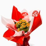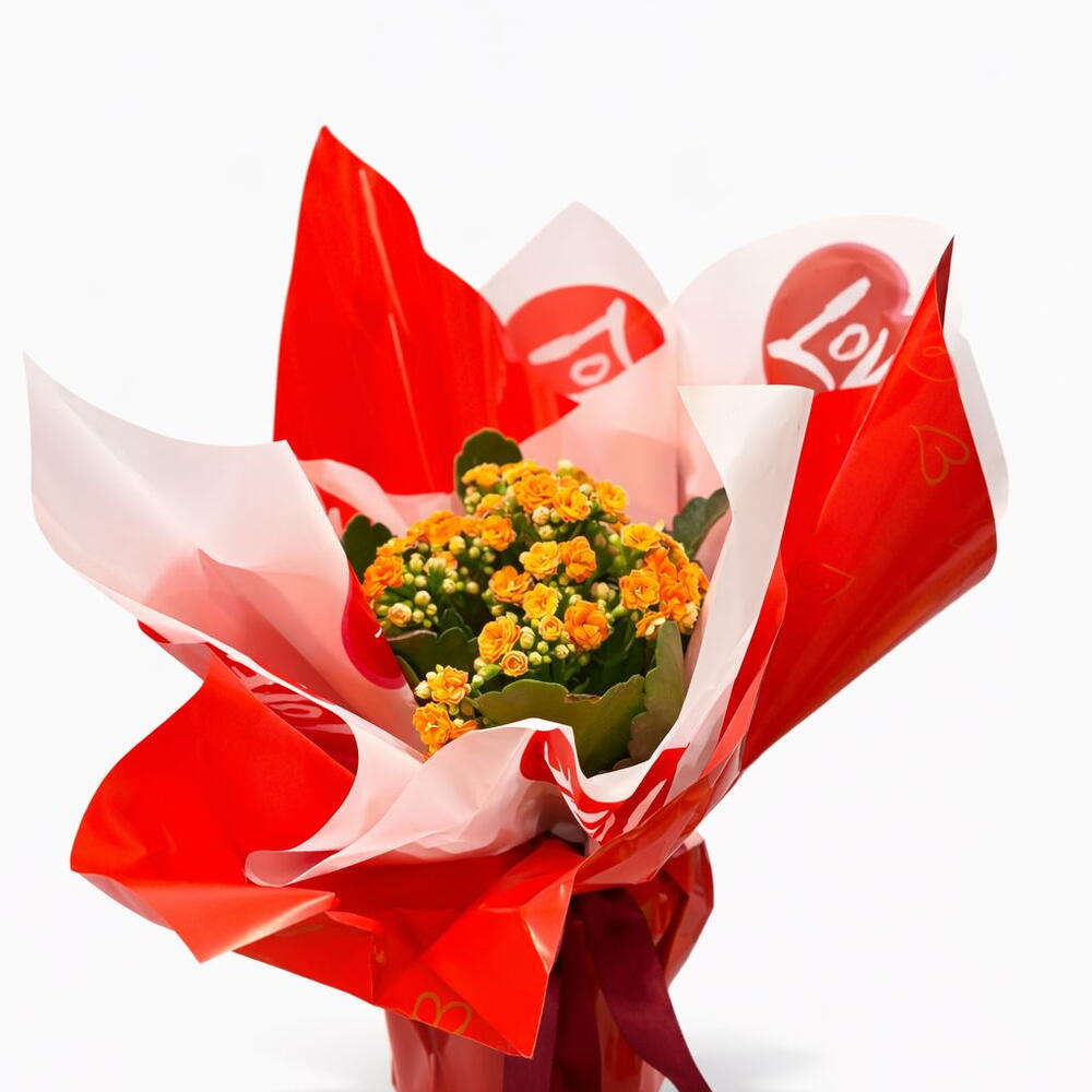 Canlı turuncu çiçekleriyle hazırlanan kalanşo, love konsept ambalajıyla romantik bir hediye sunar.