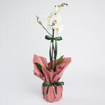 Single-stem white orchid wrapped in a salmon-colored bouquet