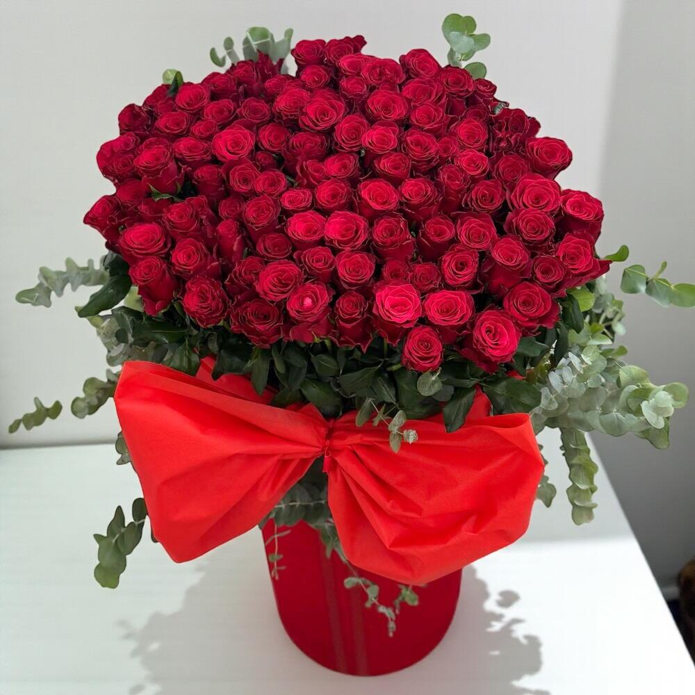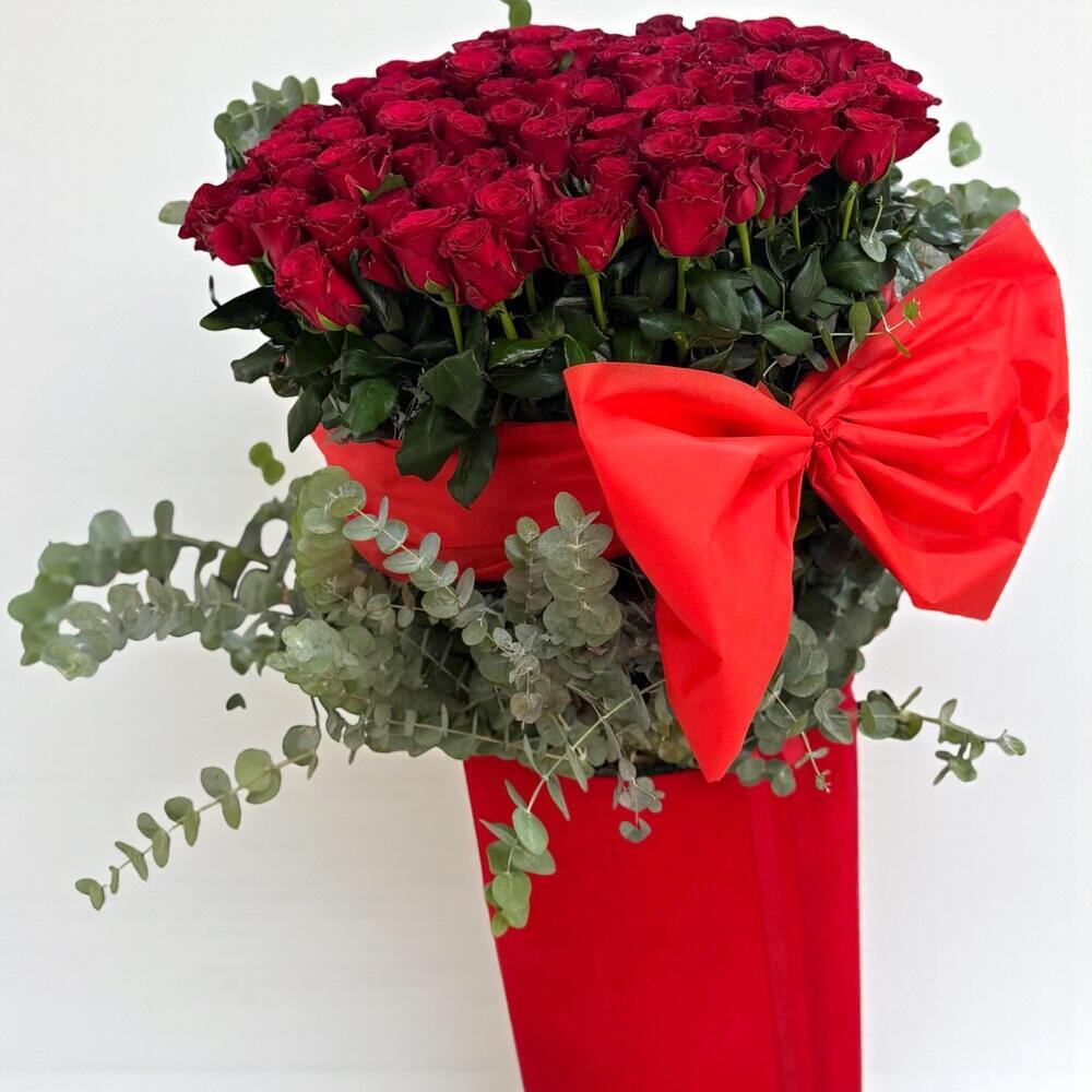 Aşkın, tutkunun ve zarafetin en etkileyici sembolü olan 101 kırmızı gül, özel tasarım 1 metrelik kutu içerisinde unutulmaz bir hediye olarak sunuluyor. Kırmızının büyüleyici tonlarıyla hazırlanan bu dev aranjman, romantik sürprizler, yıldönümleri, doğum günleri veya özel kutlamalar için mükemmel bir tercihtir. Her biri özenle seçilmiş 101 adet taptaze kırmızı gül, zarif okaliptüs yapraklarıyla tamamlanarak estetik bir uyum oluşturur. Büyük kırmızı fiyonk detayı ise aranjmana ekstra bir şıklık ve ihtişam kazandırır. Bu özel çiçek tasarımı, sevdiklerinize duygularınızı en unutulmaz şekilde ifade etmenizi sağlar.