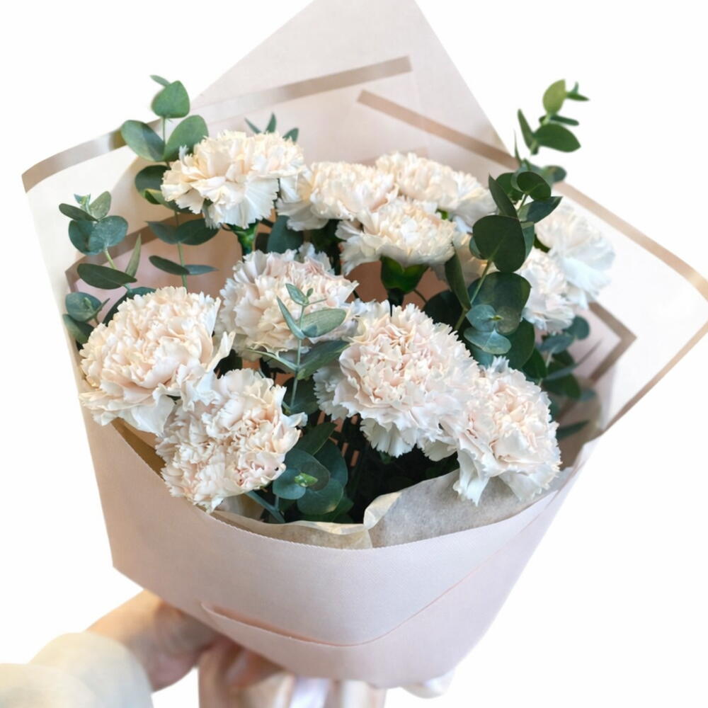 Beyaz renkli ambalaj içerisine hazırlanmış 10 adet Beyaz karanfil buketi.