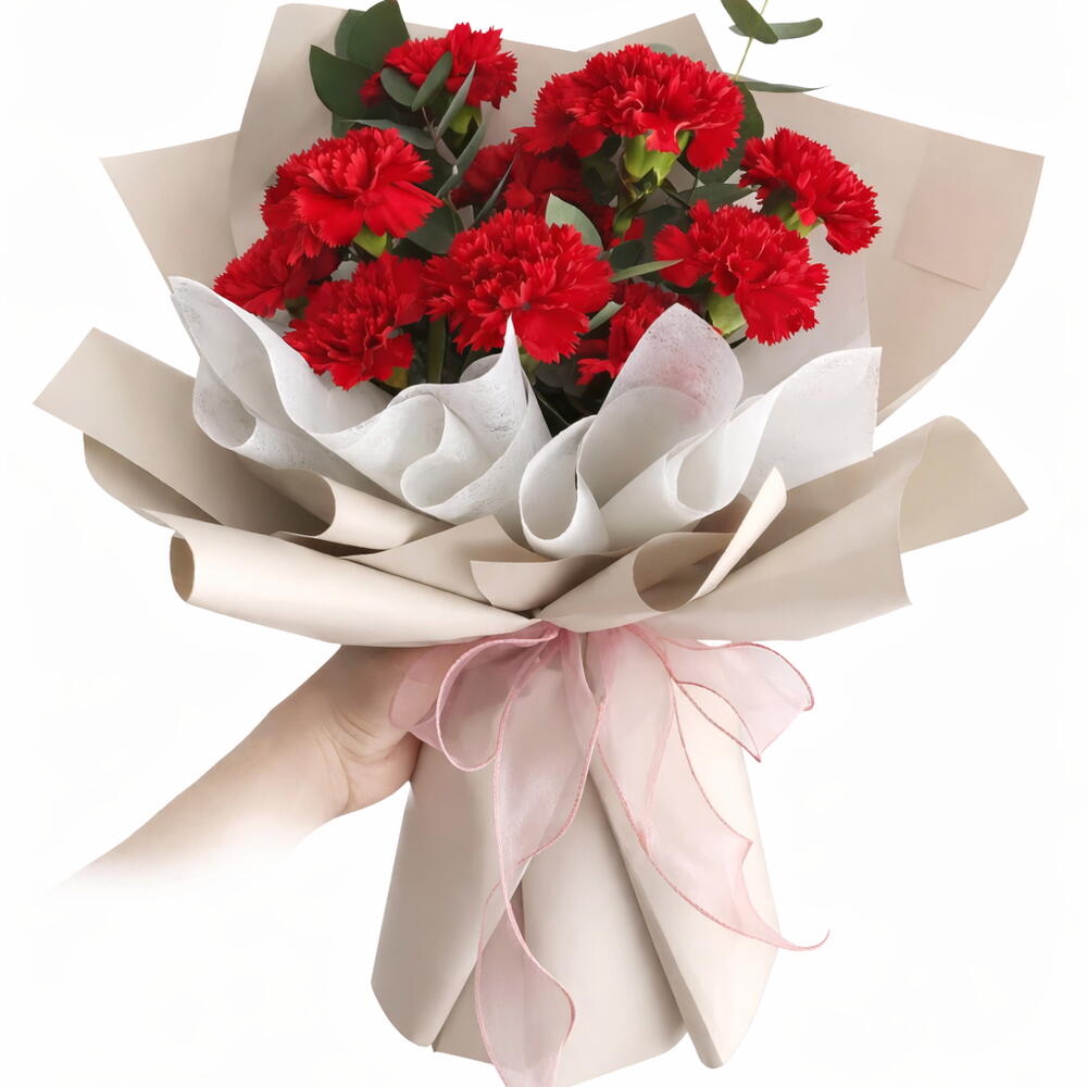 Beyaz renkli ambalaj içerisine hazırlanmış 10 adet Kırmızı karanfil buketi.