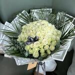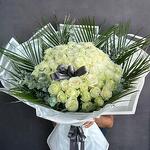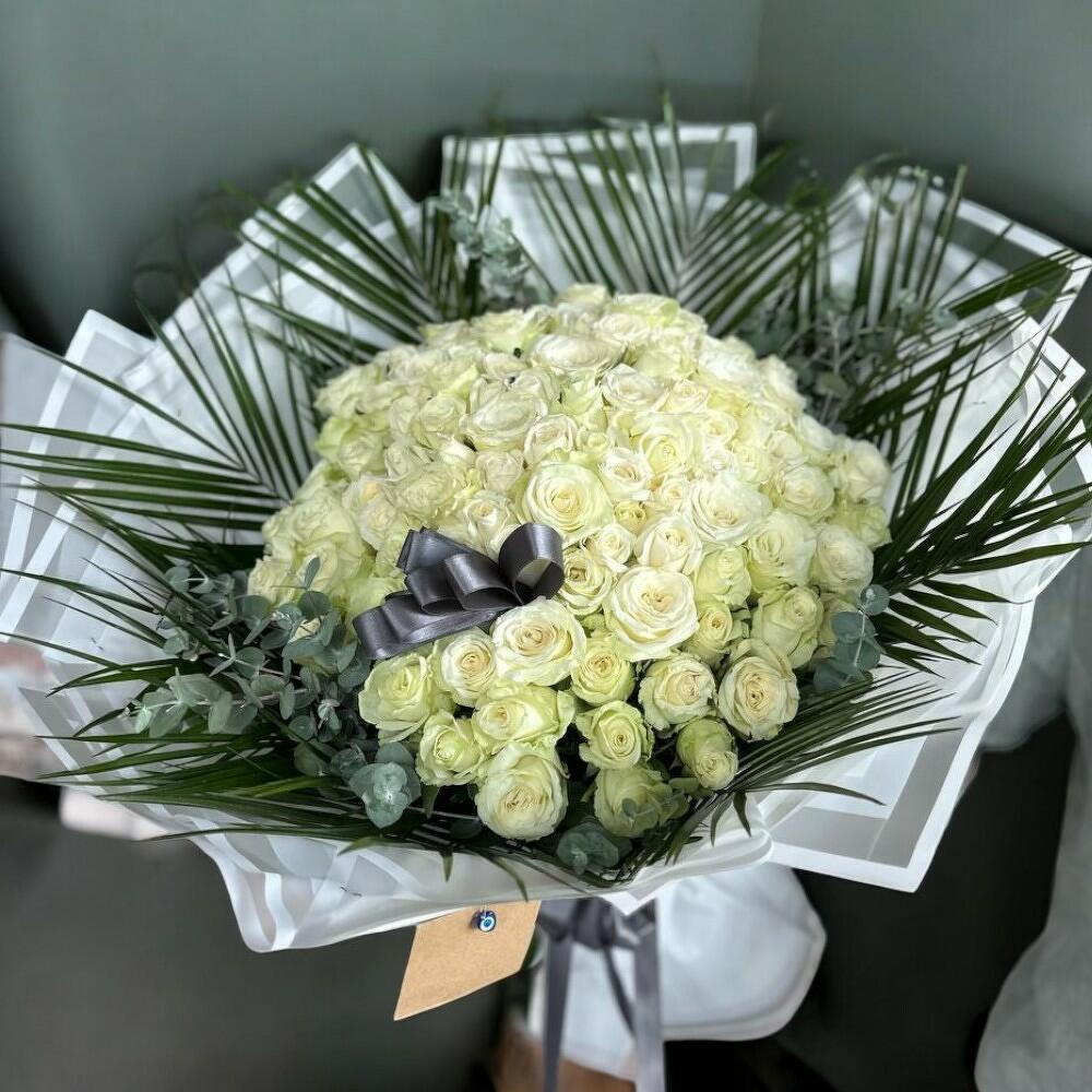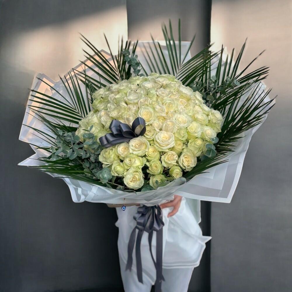 Bu zarif mono buket, 100 adet beyaz gül, 10 adet fırtınalı fenix yaprağı ve 10 adet ferahlatıcı okaliptüs içermektedir. Kendine güvenen ve sofistike bir hava yakalamak isteyenler için mükemmel bir seçim. Bu büyüleyici buket, herhangi bir oda veya etkinlik için etkileyici bir atmosfer yaratacaktır.