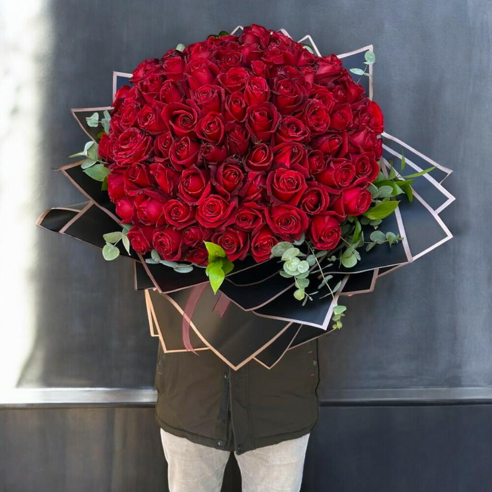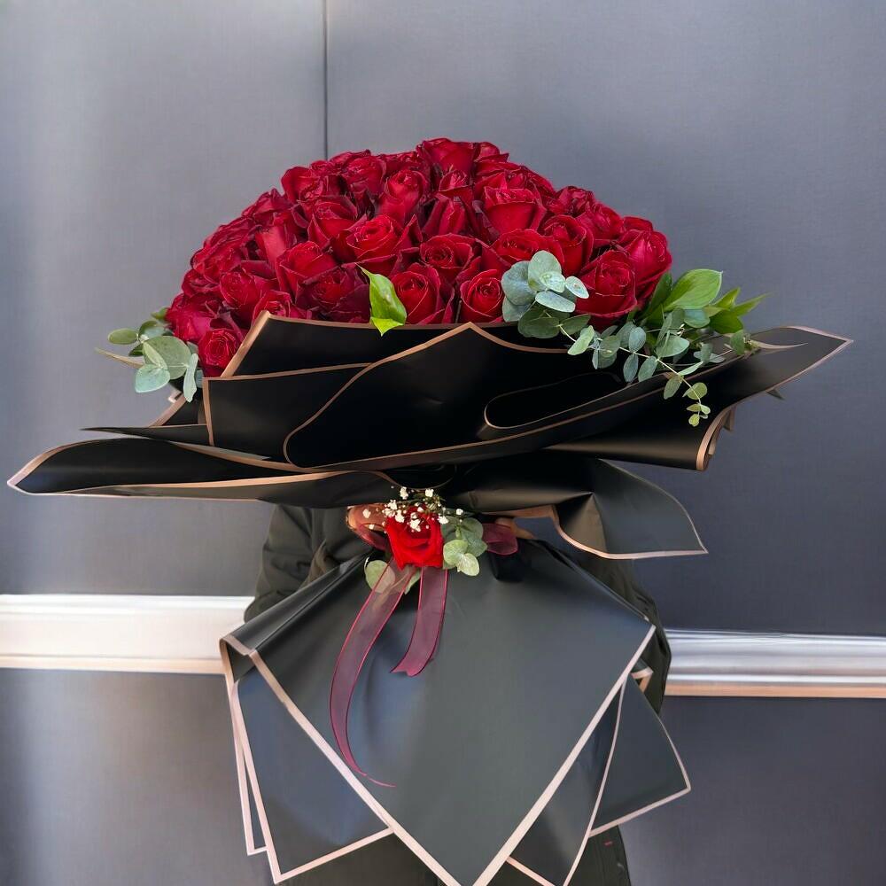 Bu etkileyici çiçek buketi, romantizmi ve tutkuyu simgeleyen 101 adet canlı kırmızı gül ve serinletici bir dokunuş sağlayan 7 adet yeşillik ile süslenmiştir. İster özel bir gününüz için, ister sevdiklerinize özel bir hediye olarak, bu çiçek buketi üzerinizde unutulmaz bir etki bırakacak.