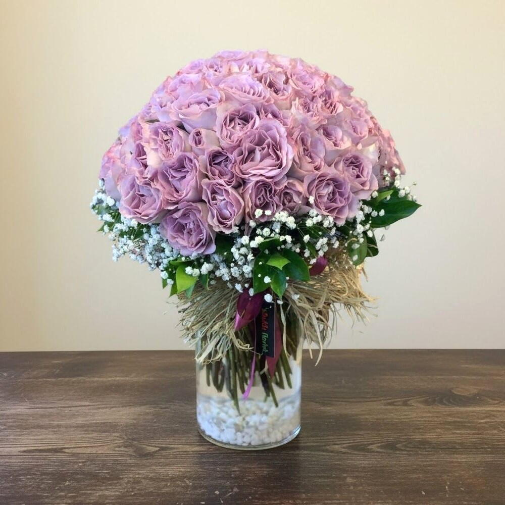 Bu büyüleyici aranjman, lila tonlarının romantik zarafetini tek bir çiçek şöleninde bir araya getiriyor. Yoğun ve gösterişli gül kubbesi, masalsı bir hava yaratırken, etrafını saran cipso çiçekleri bukete yumuşak ve bulutumsu bir dokunuş katıyor. Şık cam vazo ve doğal jüt detayları, aranjmanı hem modern hem de doğal bir görünüme kavuşturuyor. Her ortamda dikkatleri üzerine çeken bu lüks tasarım, özel günlerde unutulmaz bir hediye olarak ideal bir seçimdir. Çiçeklerin uzun süre canlı kalması için vazo suyunu her gün tazeleyerek sapların altından 1–2 cm kesmenizi öneririz. Aranjmanı doğrudan güneş ışığı almayan, serin bir ortamda muhafaza ederek tazeliğini daha uzun süre koruyabilirsiniz.