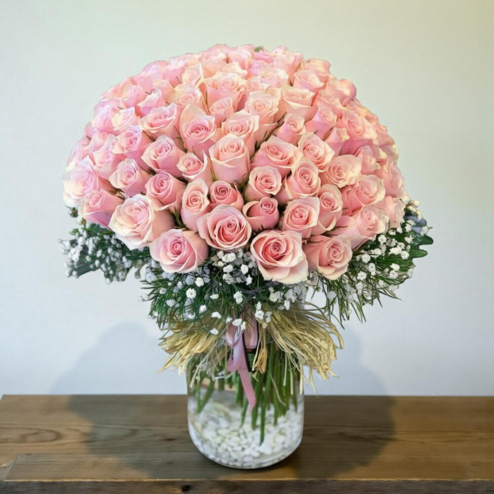 Bu zarif aranjman, yumuşak pembe tonlarındaki güllerin oluşturduğu muhteşem bir çiçek kubbesiyle göz kamaştırıyor. Romantik ve sofistike havasıyla özel anları unutulmaz kılan bu tasarım, adeta pembe bir çiçek okyanusu gibi ışıldıyor. Cipso çiçeklerinin hafif ve masalsı dokusu, güllerin güzelliğini daha da belirgin hale getirirken, doğal jüt detayları modern ve rustik bir uyum yaratıyor. Şık cam vazo içindeki taş dekoru ise aranjmana ekstra bir zarafet katıyor. Daha uzun ömür için vazo suyunu her gün yenilemeyi ve güllerin saplarından 1–2 cm kesmeyi tavsiye ederiz. Aranjmanı serin, direkt güneş ışığı almayan bir yerde tutarak tazeliğini maksimum seviyeye çıkarabilirsiniz.