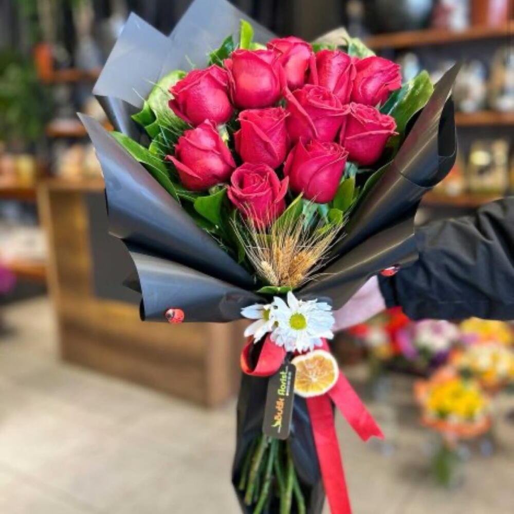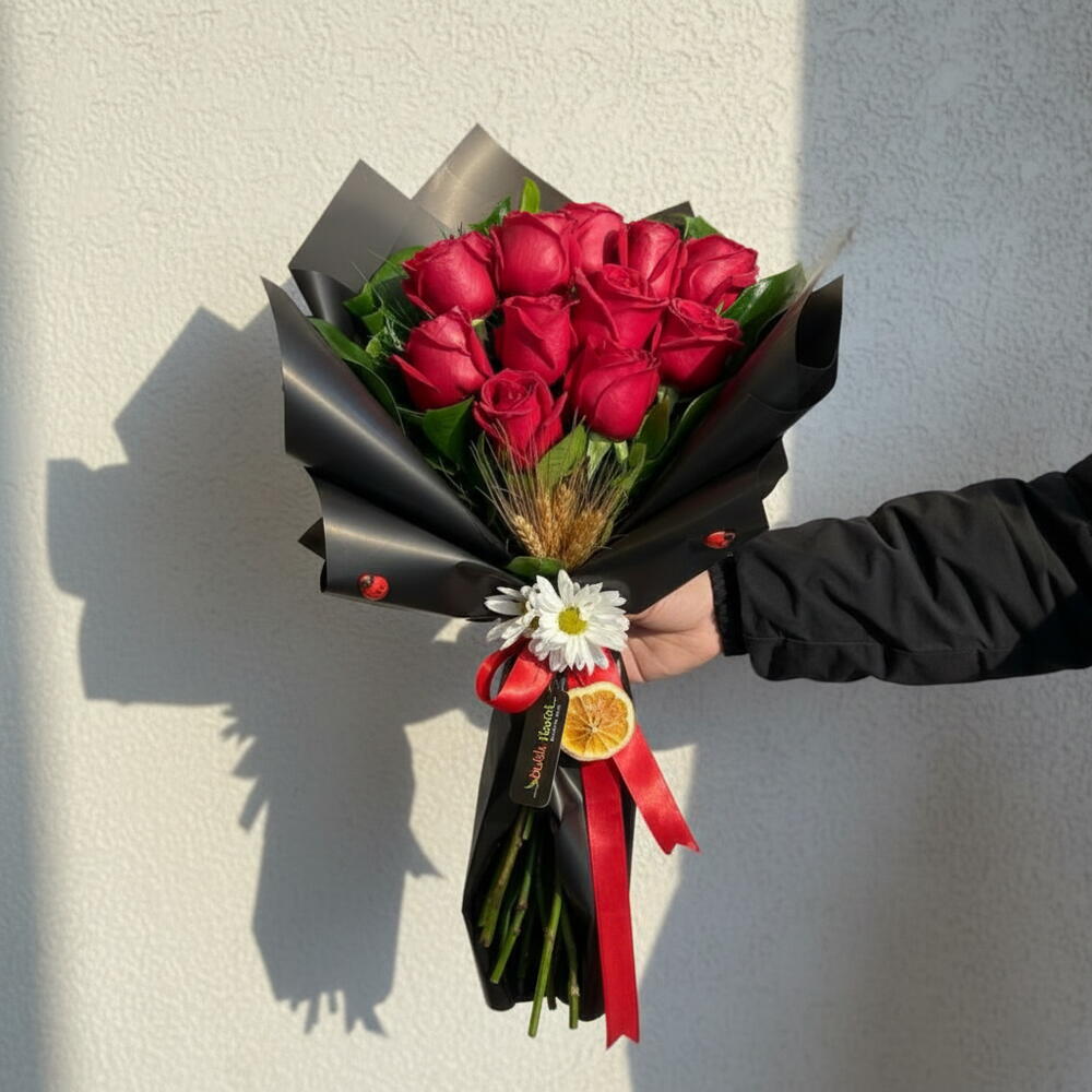 kırmızı gül - 11 adet yeşillik - 8 adet