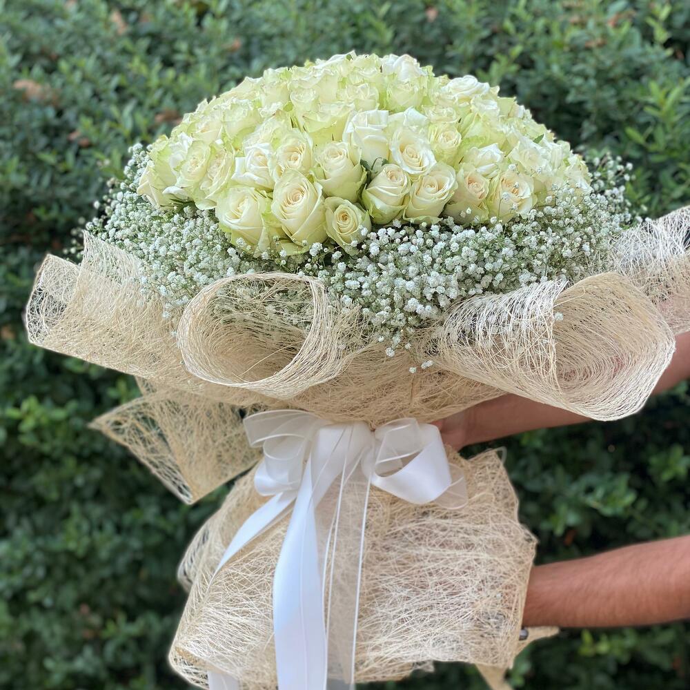 Bu zarif çiçek buketi, romantizmi ve zarafeti temsil eder. 121 adet beyaz gül, görsel bir şölen sunarken, 100 parça cipsofilya delikli kişiliğini ekler. Bir adet saten kurdele ve bir adet organze kurdele ile süslenmiş olan bu buket, aşkınızı ve değerli anılarınızı kutlamak için mükemmel bir yol sunar. Son olarak, bu muhteşem çiçekleri, 20 parçadan oluşan abaka ambalajdaki güzel bir sunumla tamamlıyoruz. Şıklığın ve romantizmin bu eşsiz karışımı, her türlü özel gün için ideal bir hediye olacaktır.