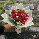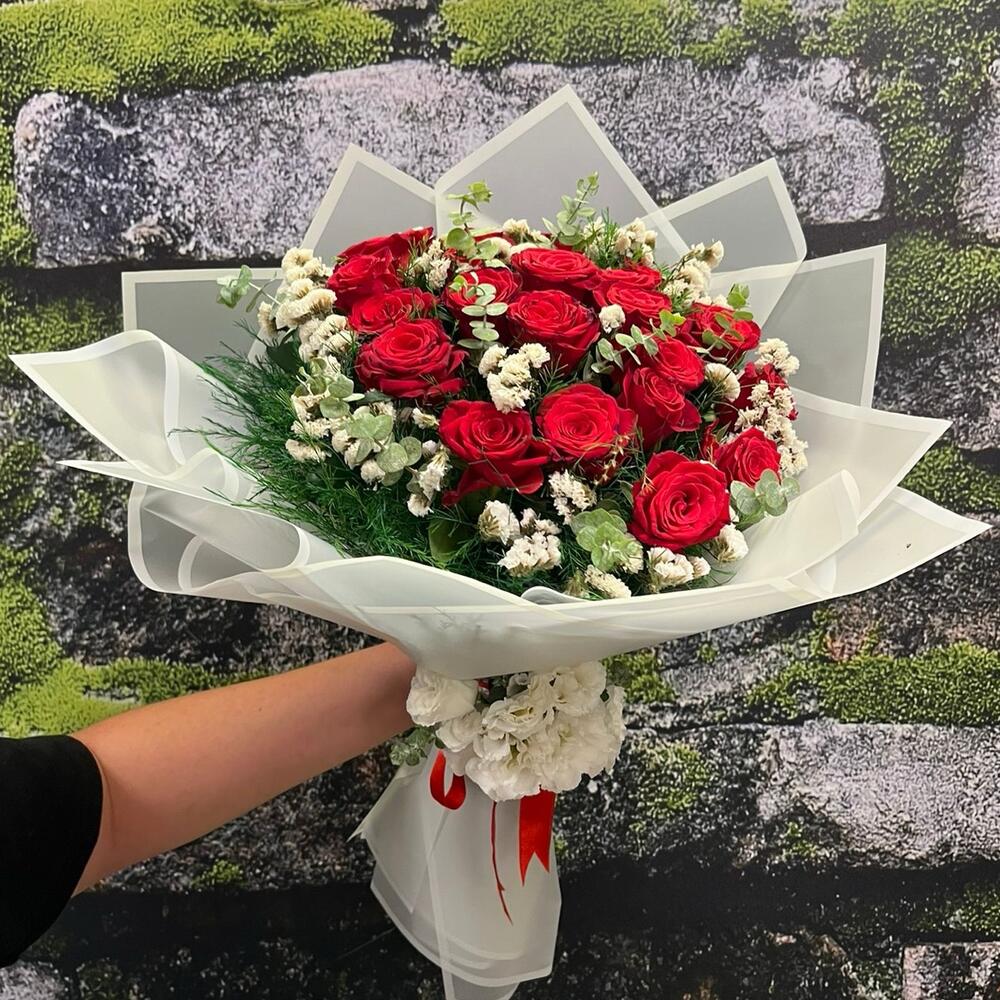 virgatus - 25 adet kırmızı gül - 15 adet okaliptus - 20 adet status - 10 adet