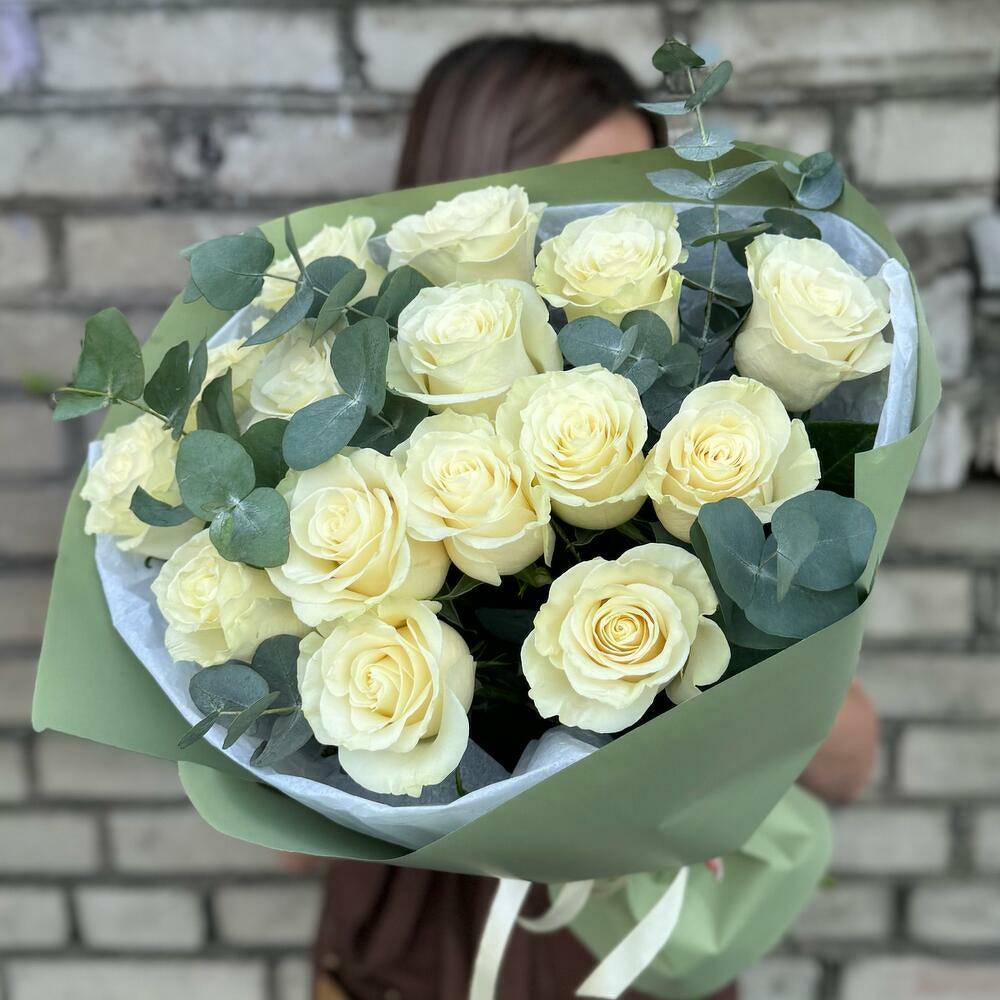 Bu zarif çiçek buketi, 15 adet beyaz gül ve 10 adet okaliptüsün mükemmel kombinasyonuyla süslüdür. Her bir çiçek, zarafet ve incelik havası katacak şekilde özenle seçilip düzenlendi. Sofistike tasarımıyla, bu buket her türlü özel anınızı kutlamak için mükemmel bir seçim olacaktır. Hem ev hem de ofis dekorasyonu için idealdir. Beyaz güller ve okaliptüslerin ferahlatıcı kokusu, ortama neşe ve pozitif enerji katacaktır.