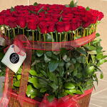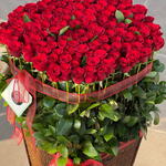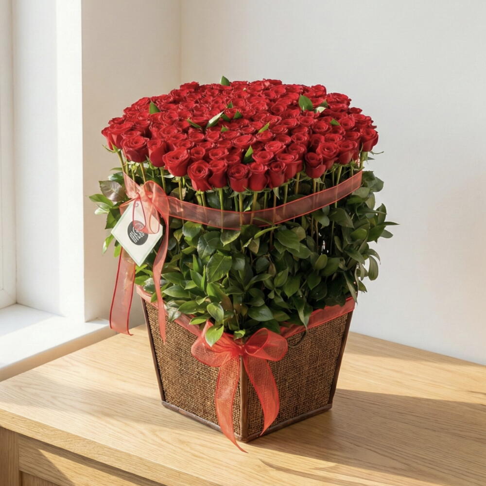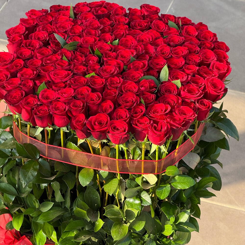 Bu özel tasarım ürün, 151 adet kırmızı gül ve 15 adet ruskus kullanılarak hazırlanmıştır. Bu ürün, güzelliği ve zarafetiyle göz kamaştırır ve alan kişiye ne kadar özel olduğunu hissettirir. Bu, romantik bir jest veya özel bir olayı kutlamak için mükemmel bir seçimdir. Kendinizi veya sevdiklerinizi bu eşsiz tasarım ile şımartın.