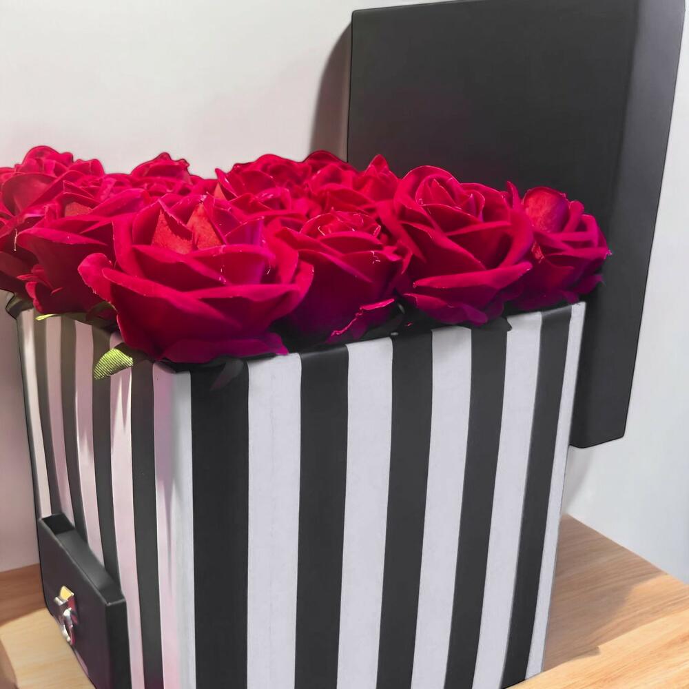 16 Kırmızı Yapay Gül Siyah Beyaz Kutulu Hediye Kutusu, sevdiklerinize şıklık ve zarafet sunmak için mükemmel bir tercihtir. Bu zarif kutuda, 16 adet kırmızı yapay gül özenle yerleştirilmiştir. Gerçeğe yakın görünüme sahip olan bu güller, romantik bir sürpriz yapmanızı veya ev dekorasyonunuzu güzelleştirmenizi sağlar. Siyah-beyaz çizgili şık kutusu, hediye kutusunun estetik görünümünü tamamlayarak özel anlarınıza ekstra bir dokunuş katacaktır. Bakım Önerileri: Yapay çiçekler, bakımı son derece kolaydır. Bu buketi düzenli olarak tozdan arındırmak için yumuşak bir bezle silmeniz yeterlidir. Buketi doğrudan güneş ışığından uzak tutarak, renklerinin solmasını engelleyebilirsiniz. Yapay güller, uzun süre boyunca güzelliklerini korur, bu yüzden sık bakım yapmanıza gerek yoktur.