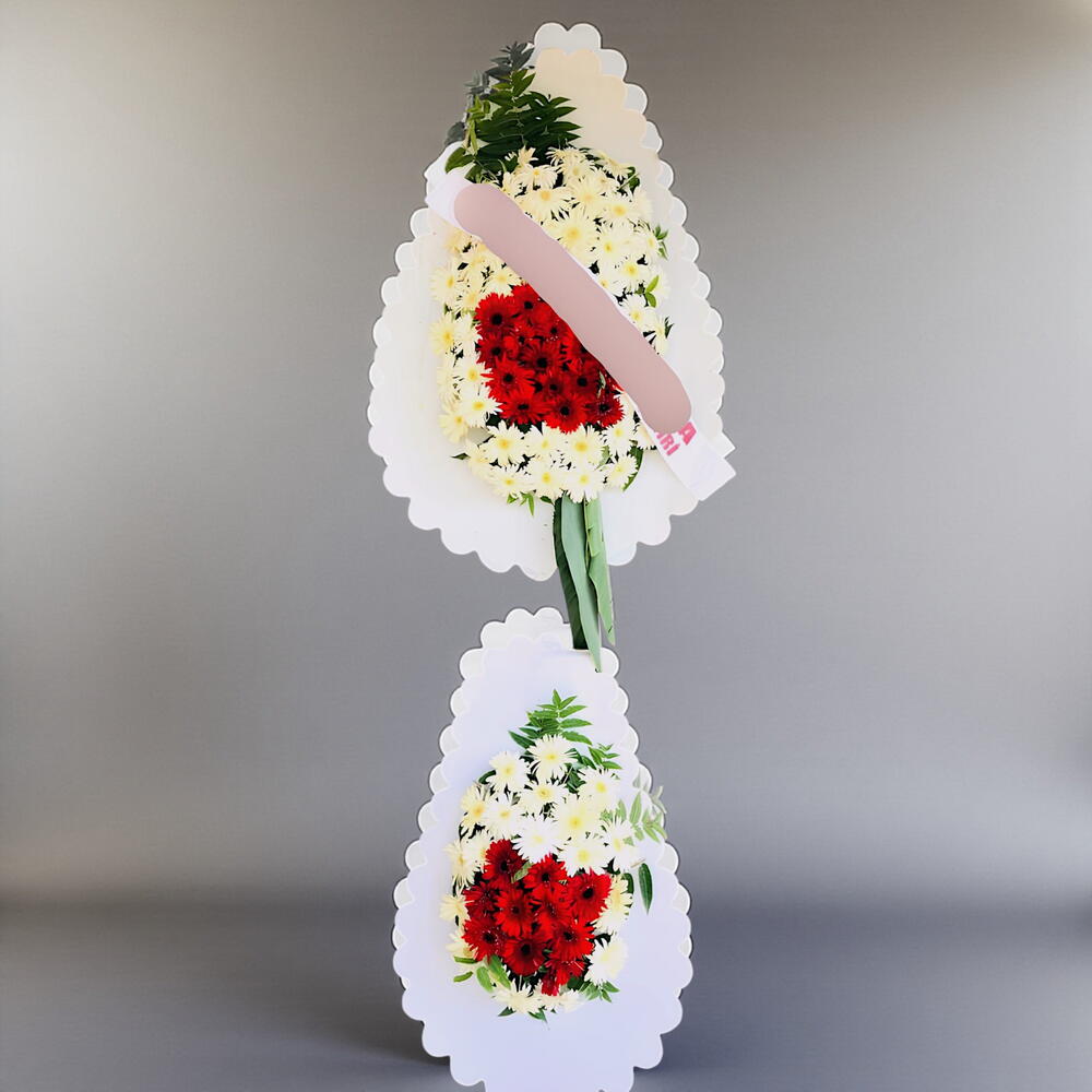 Bu etkileyici düğün çelenği, 60adet beyaz gerbera, 20 adet kırmızı gerbera çiçeklerinin muhteşem birlikteliğinden oluşmaktadır. Bu eşsiz kombinasyon, herhangi bir düğün törenine büyüleyici bir dokunuş katmak için idealdir. Üstün kalite çiçeklerden oluşan bu çelenk, düğünlerinizi unutulmaz kılacak zarif bir detaydır
