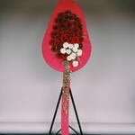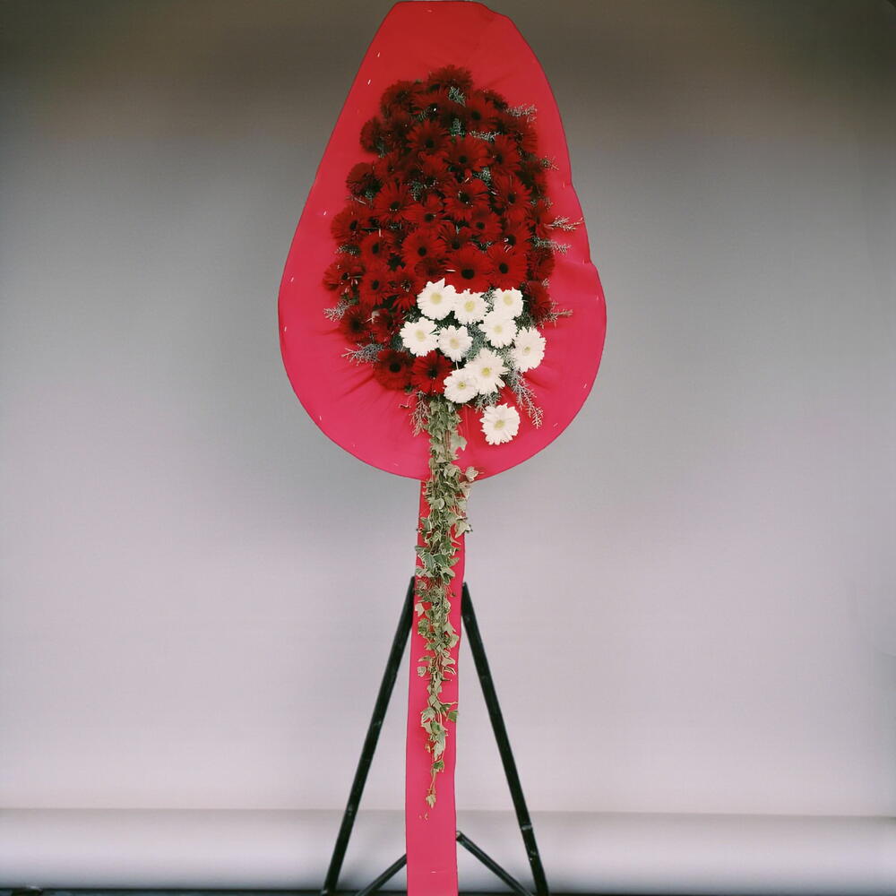 beyaz gerbera - 10 adet kırmızı gerbera - 40 adet yesillik - 3 adet yazı şeridi - 1 adet