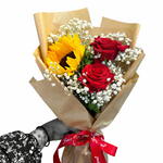Kraft ambalaj içerisinde hazırlanmış 2 adet Kırmızı Gül, 1 adet Ay çiçeği ve cipsolardan yapılmış buket.
