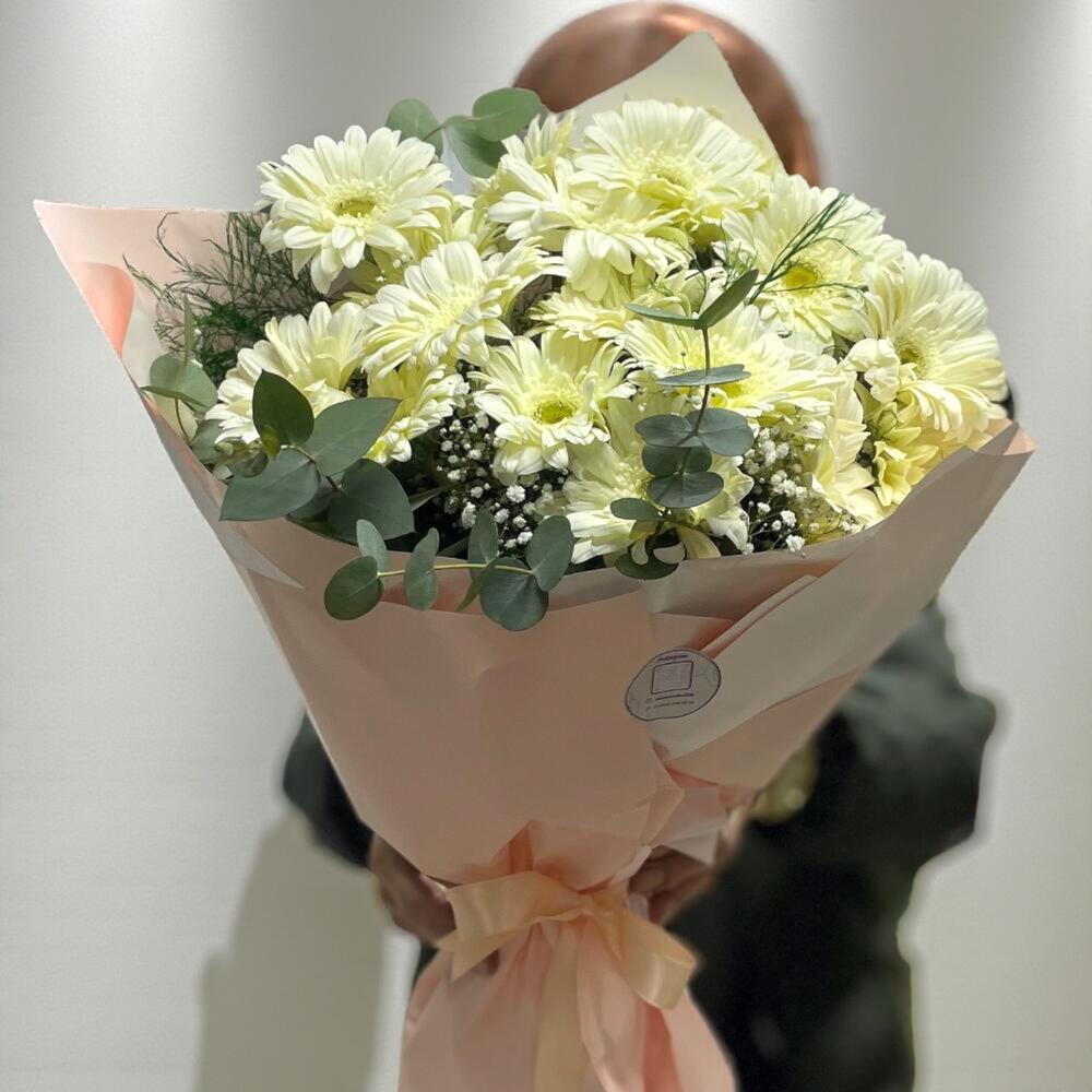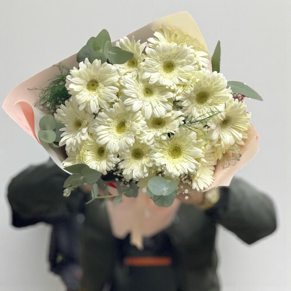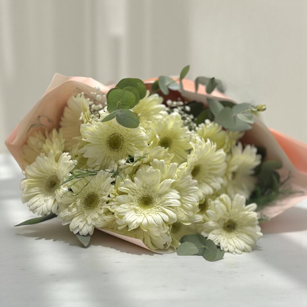 Saflığın, zarafetin ve huzurun simgesi olan beyaz gerberalarla hazırlanan bu gösterişli buket, her özel an için şık ve anlamlı bir hediye seçeneğidir. 20 adet taze beyaz gerbera, okaliptüs yaprakları ve zarif gipsofilalarla tamamlanarak modern bir görünüm kazanmıştır. Yumuşak pembe ambalaj ve saten kurdele detayı, bukete sade ama etkileyici bir dokunuş katar. Doğum günleri, yıldönümleri, kutlamalar veya “iyi ki varsın” demek için ideal bir seçimdir.