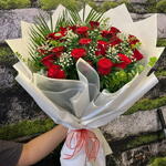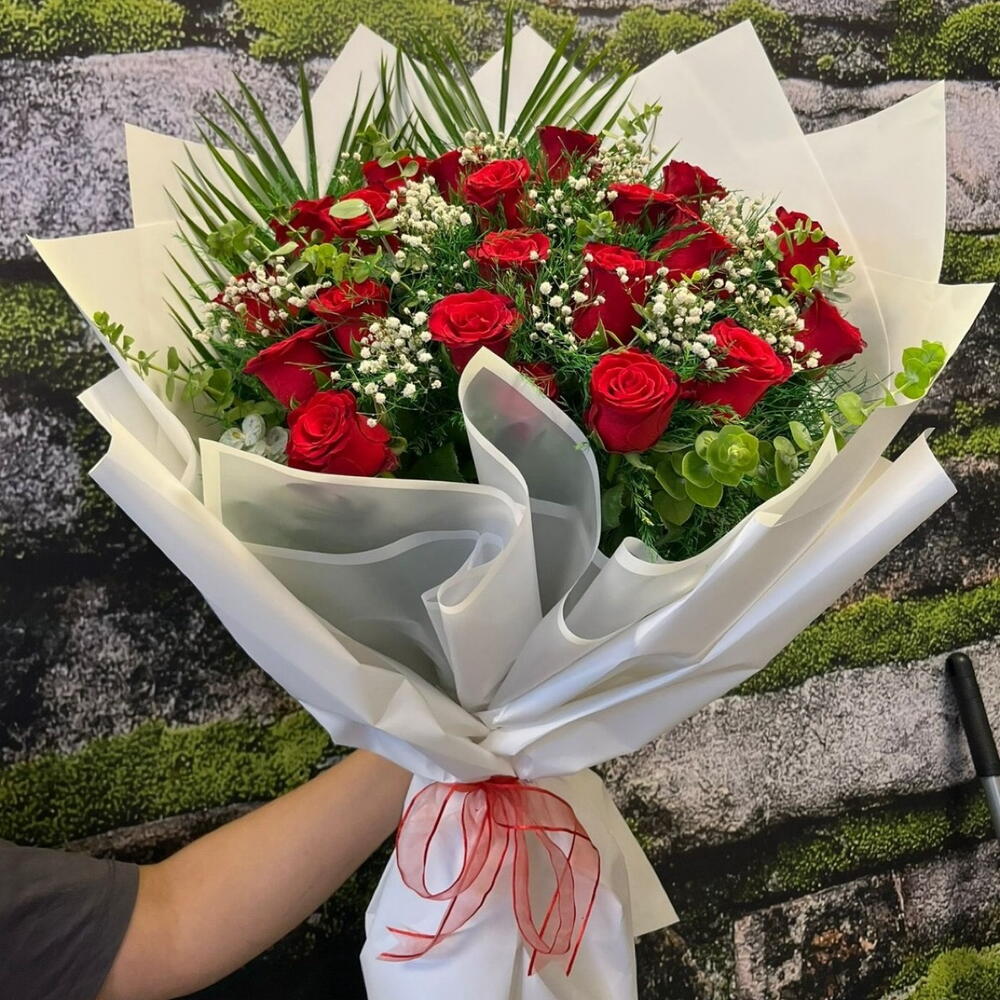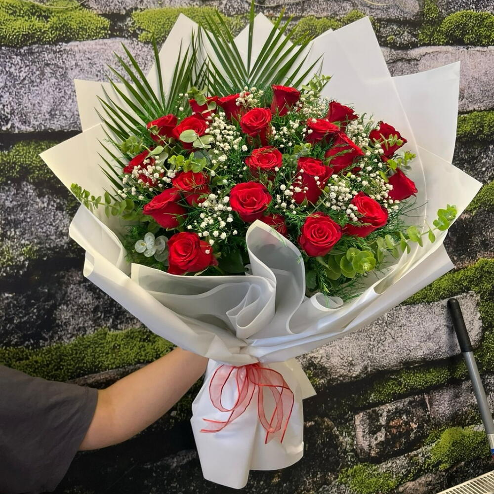 virgatus - 30 adet kırmızı gül - 21 adet okaliptus - 20 adet fenix yaprak - 2 adet cipso - 20 adet